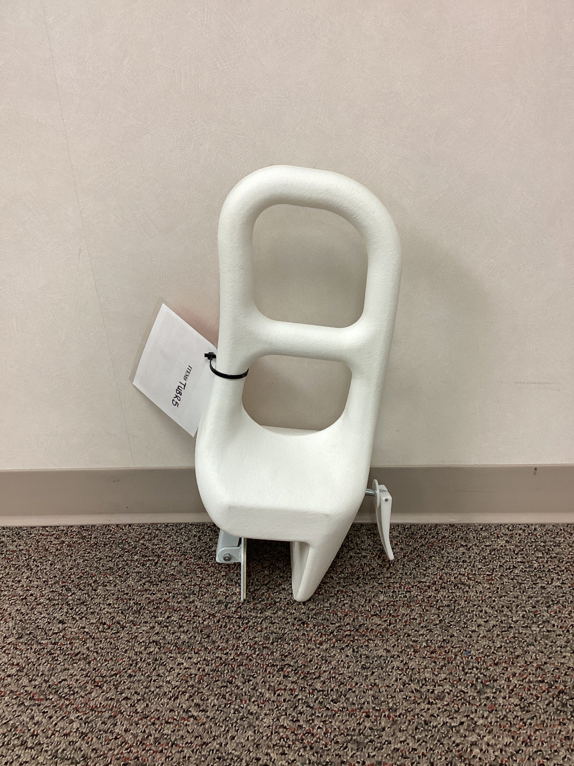 Drive brand whilte removable bathub grab rail that is 21" long and features 2 handle positions. The bath rails clamp attaches by turning the locking mechanism which tightens the secure grip pads on all bath tub contact points. The clamp is 2.5" apart at its tighest and 5" at its loosest. No weight capacity is listed.