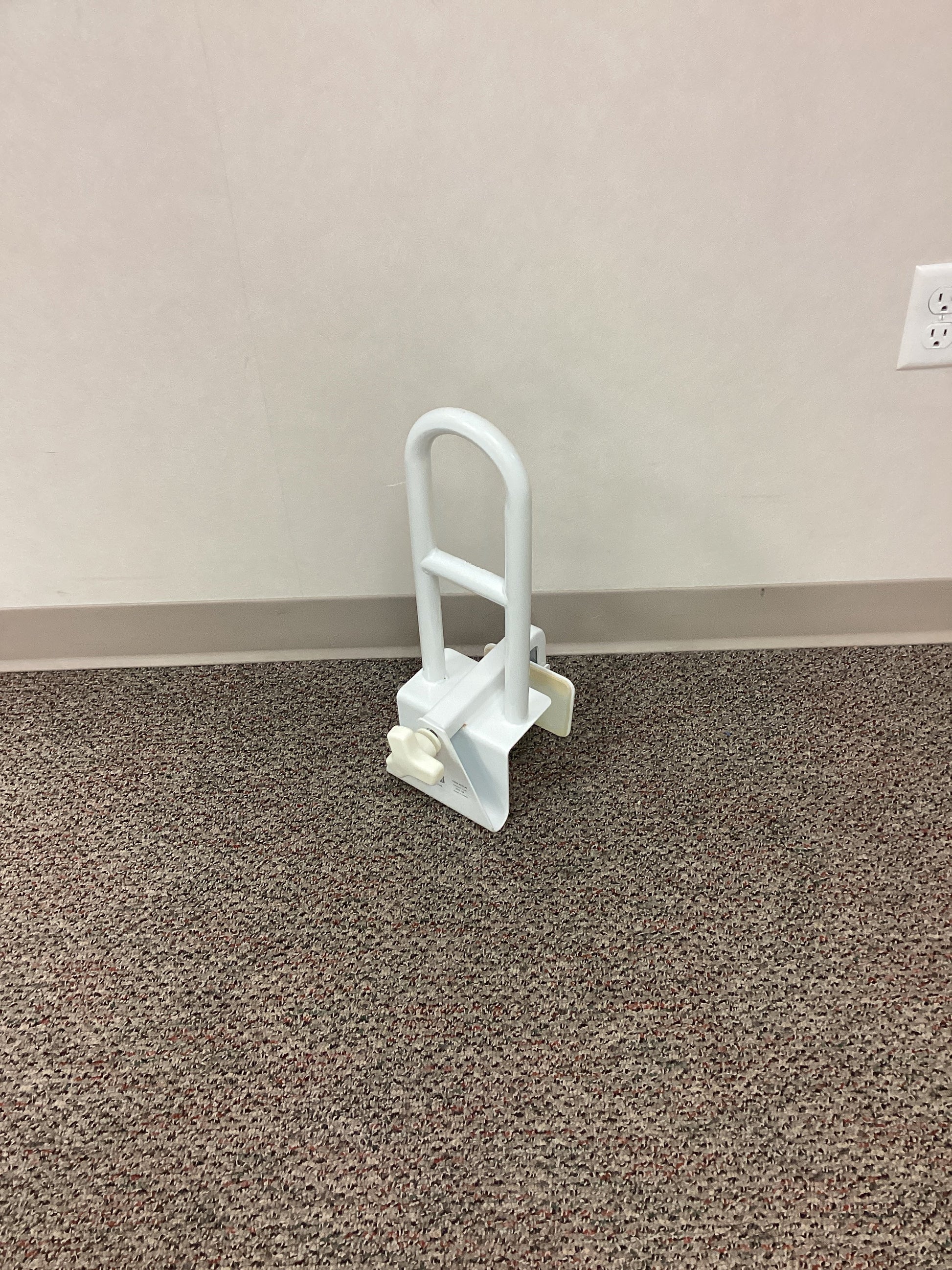 White, metal, removable bathtub grab rail that is 5.5" wide. The handle is 15" tall from the top of the clamp. The clamp is adjustable to fit a wide variety of tubs. No weight capacity listed.