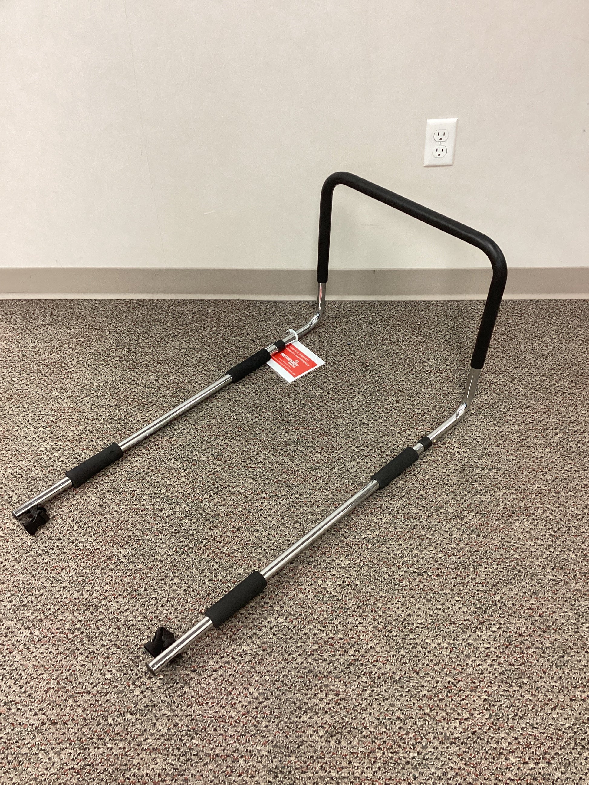 Drive brand metal bed rail with foam handle that is 18" tall. The mattress insert is 36" long and the overall width is 19.5". This bed rail comes with two buckles on the end of the mattress insert that is meant for a securing strap, but this bed rail does not come with a securing strap. No weight capacity is listed.