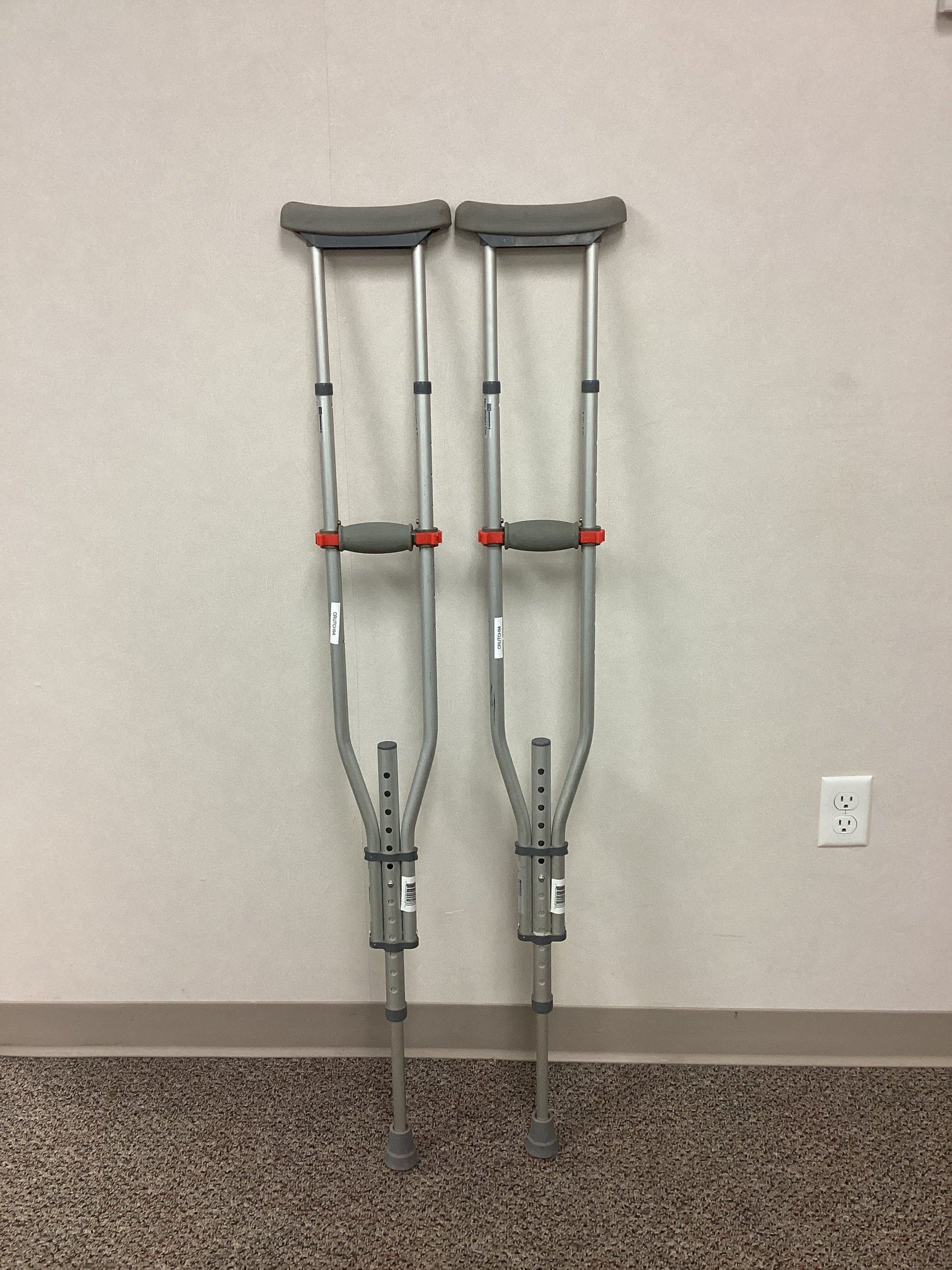 Medline brand quick fit aluminum crutches with slip-resistant feet and adjustable handles. These crutches are height adjustable from 4'7" to 6'7" and can accomodate youth, adults, and tall adults. These crutches also feature padded armpit cushions for increased comfort. Weight capacity is 300 lbs.