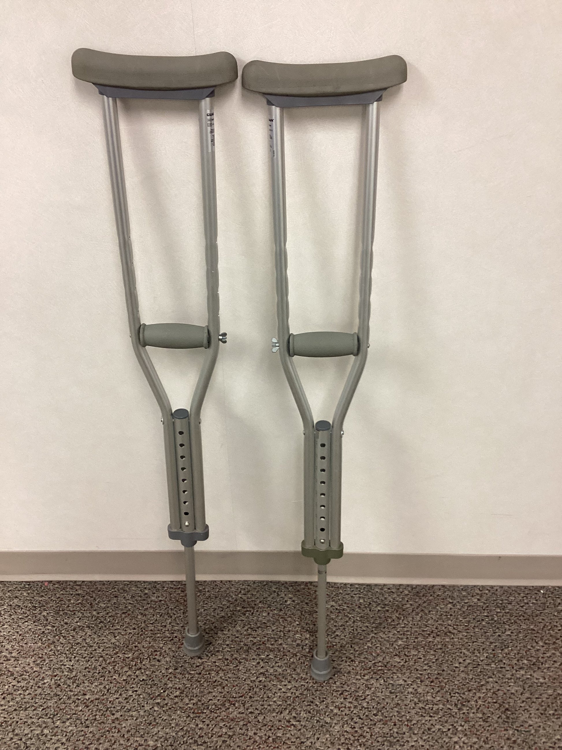 Gaurdian brand aluminum crutches with slip-resistant feet and adjustable handles. These crutches are height adjustable from 4'6" to 5'2". These crutches also feature padded armpit cushions for increased comfort. Weight capacity is 300 lbs.