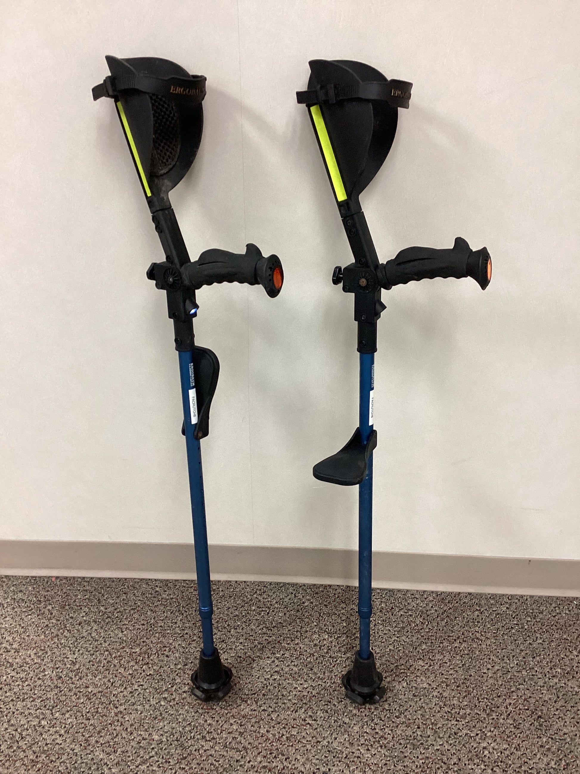 Ergoactivities brand Ergobaum forearm crutches with rubber handles and rubber forearm opening that is 4" wide and 7" long. These crutches have non-skid rubber tips and are height adjustable from 32" to 40". The height from the handle to the forearm opening is adjustable from 10" to 11". These crutches are easily adjustable and include a knee rest on both crutches. The crutches also include reflectors and lights powered by LR44 bateries. Weight capacity is 350lbs.
