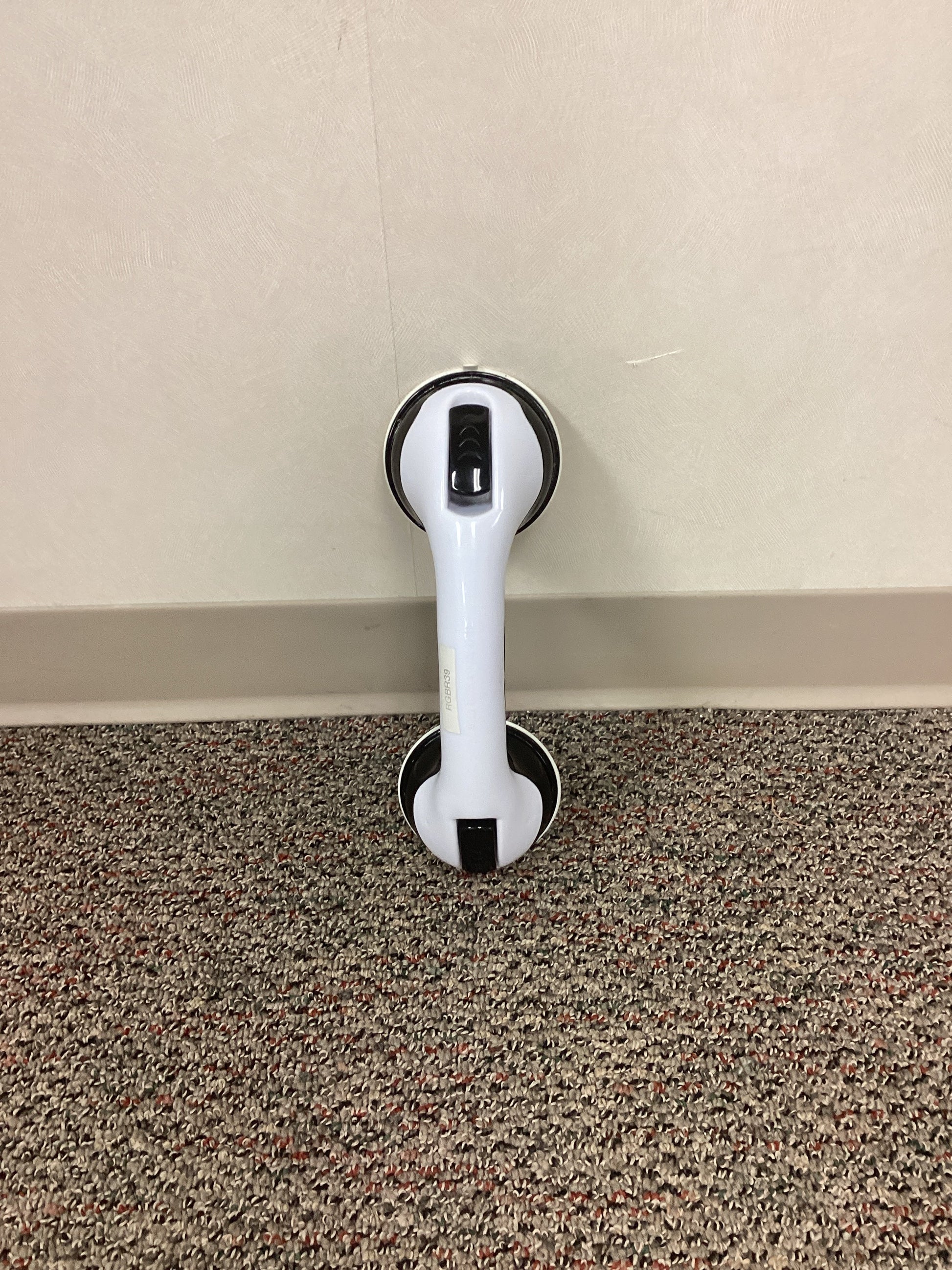 Black/white grab bar with suction grip (no brand listed). This grab bar is 11" long and the suction cups are 4" in diameter.