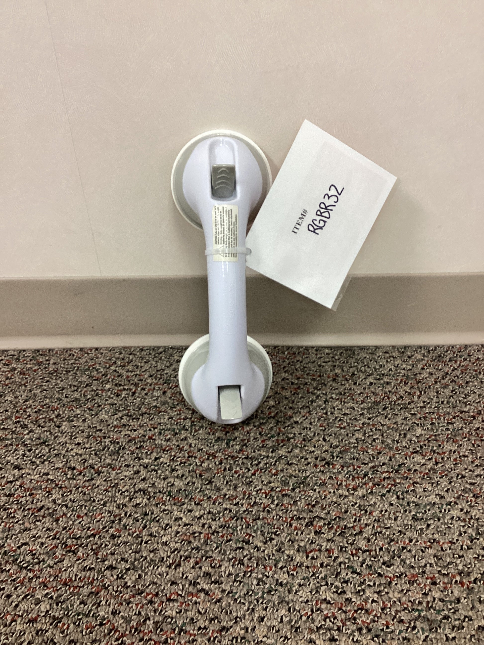 MHI brand white/grey grab bar with suction grip and textured rubber on handle for better grip. This grab bar is 11.5" long and the suction cups are 4" in diameter.