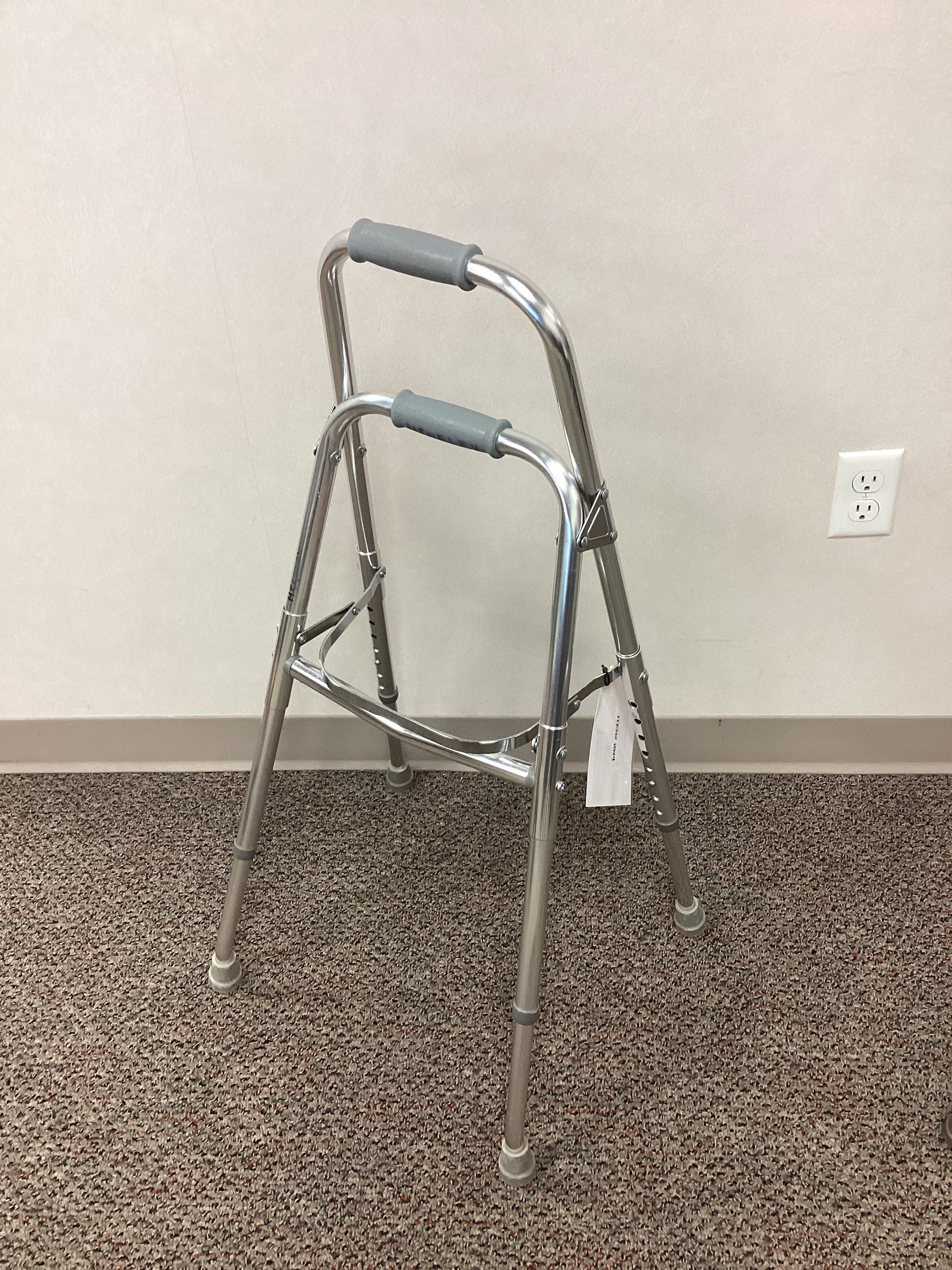 Drive brand steel hemi walker designed for individuals with the use of only one hand or arm. This walker has 2 rubber handles at varying heights and non-skid rubber tips on all 4 legs. This walker is 19" wide at the base, height adjustable from 30" to 37" (top handle) and 24" to 31" (bottom handle), and foldable for ease of transport. Weight capacity is 300 lbs.