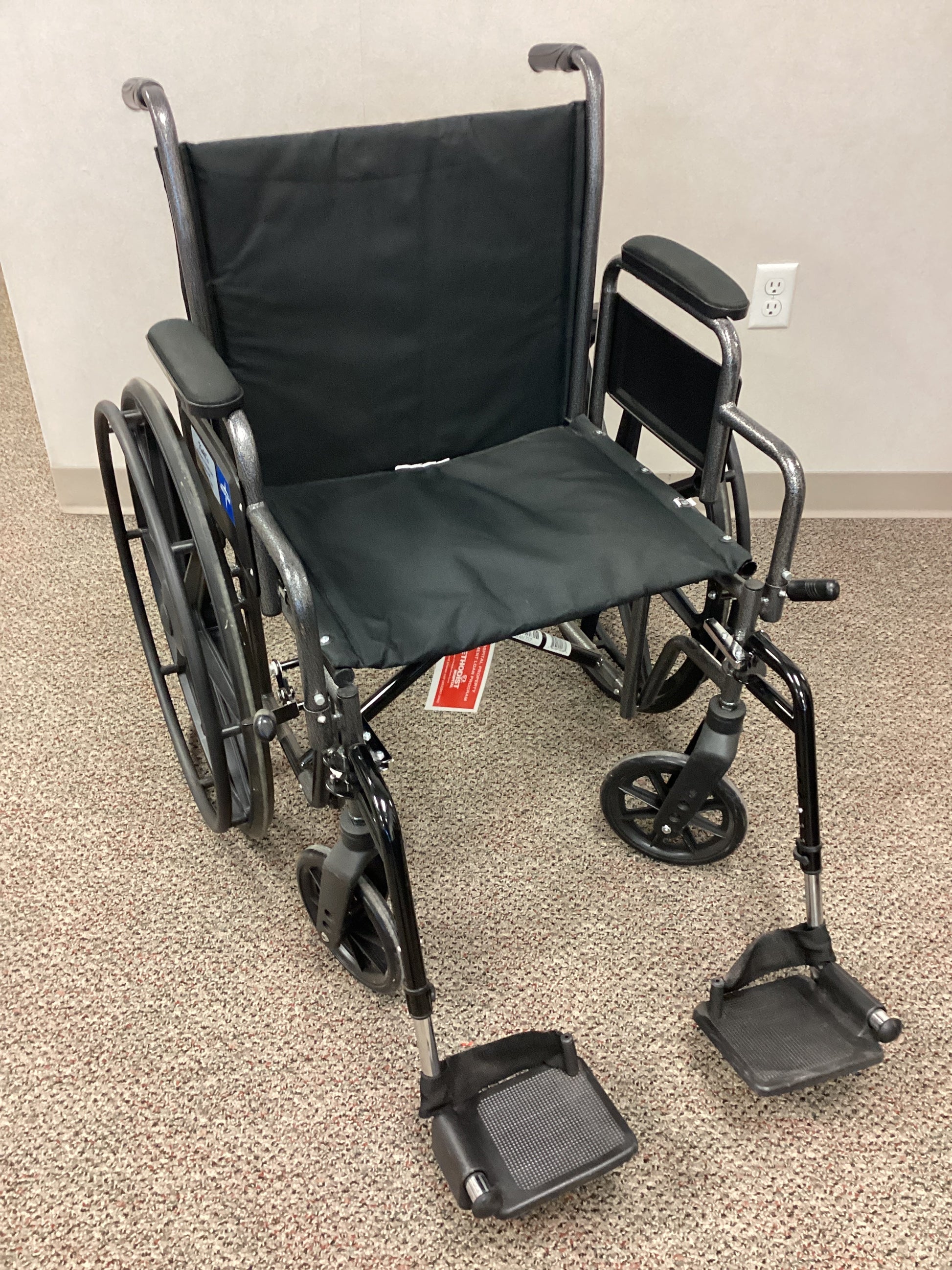 20"x15" Medline brand manual wheelchair with desk length, padded arm rests. The arm rests are removable. Back rest height is 17" and seat to floor height is 18". This chair comes with swing away, height adjustable, and removable foot rests with heel straps. Brakes are pull backwards to lock. This chair is able to be folded for ease of transport. Weight capacity is 300lbs.