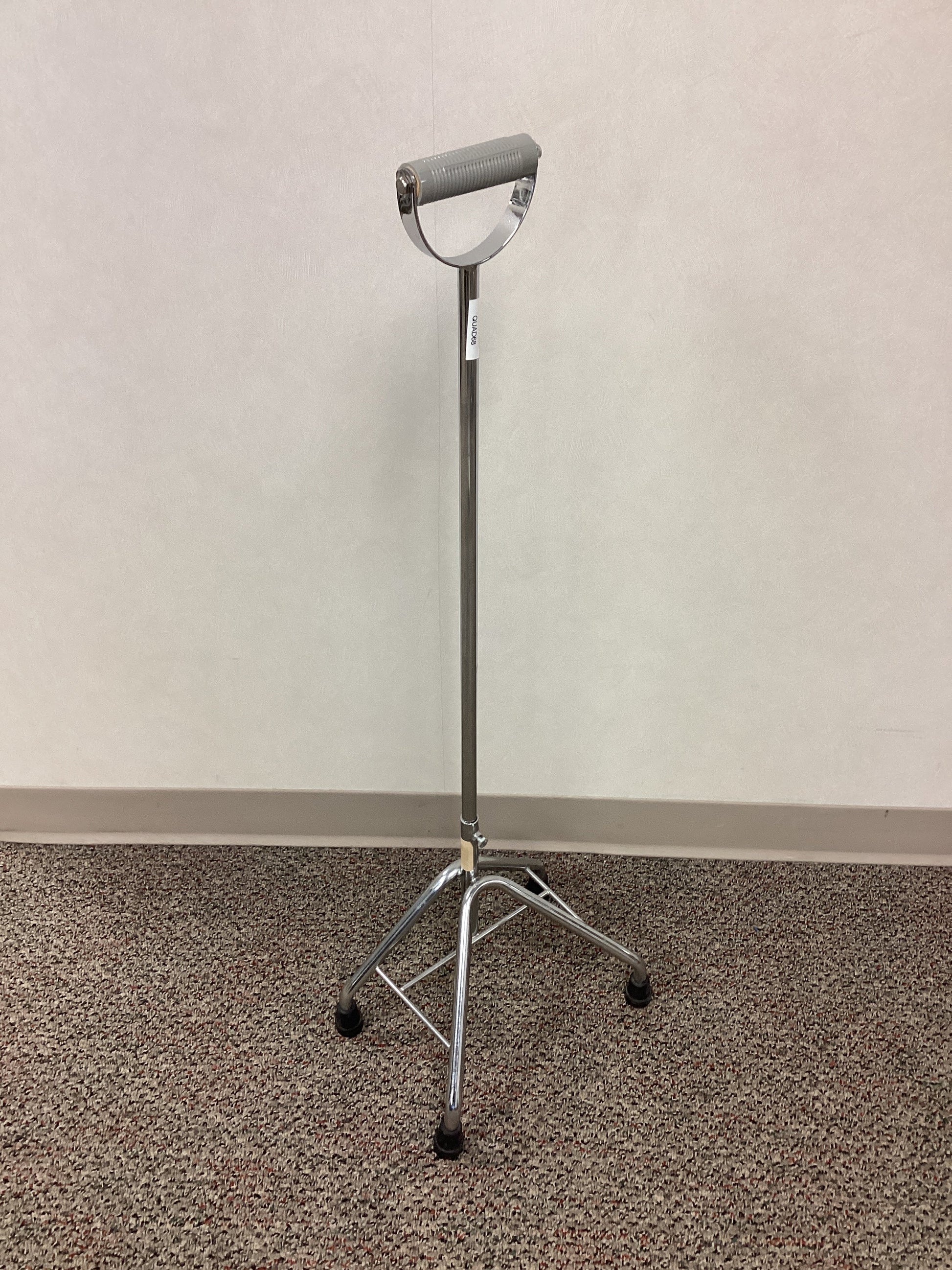 Steel quad cane with unique half-moon shaped handle and non-skid rubber tips on all feet. This cane is not height adjustable and stands at 38" tall, but can be used on both the right and left hand side. The base of this cane is 8.5" wide and 12.5" long. No weight capacity is listed.