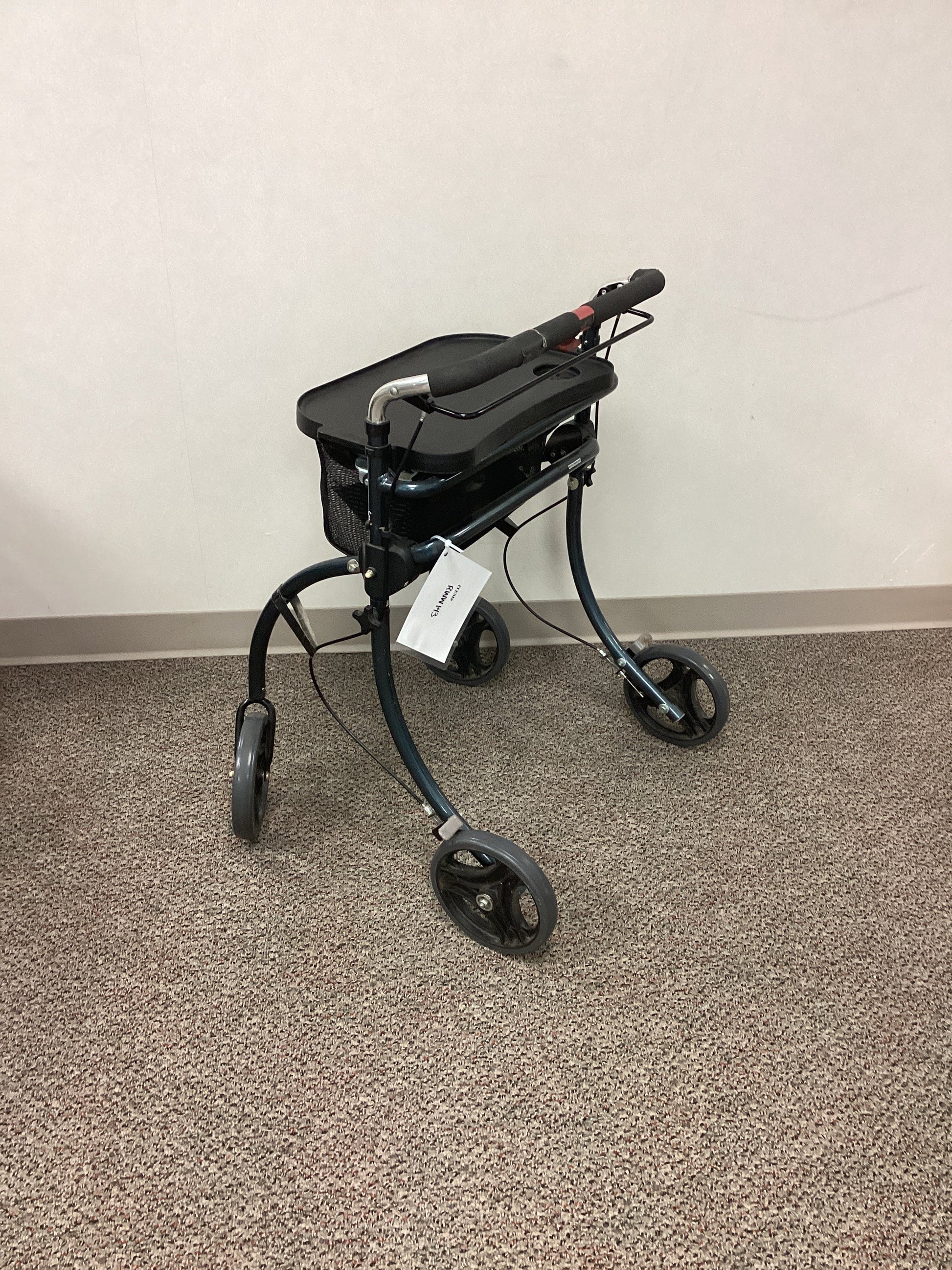 Carex brand rollator walker with 4 wheels that are 8" in diameter. This walker is not height adjustable and is 23.5" wide. This walker does not have a seat, but does have a removable tray table and a basket underneath. No weight capacity is listed. Brakes are pull-to-brake. The walker is not foldable.