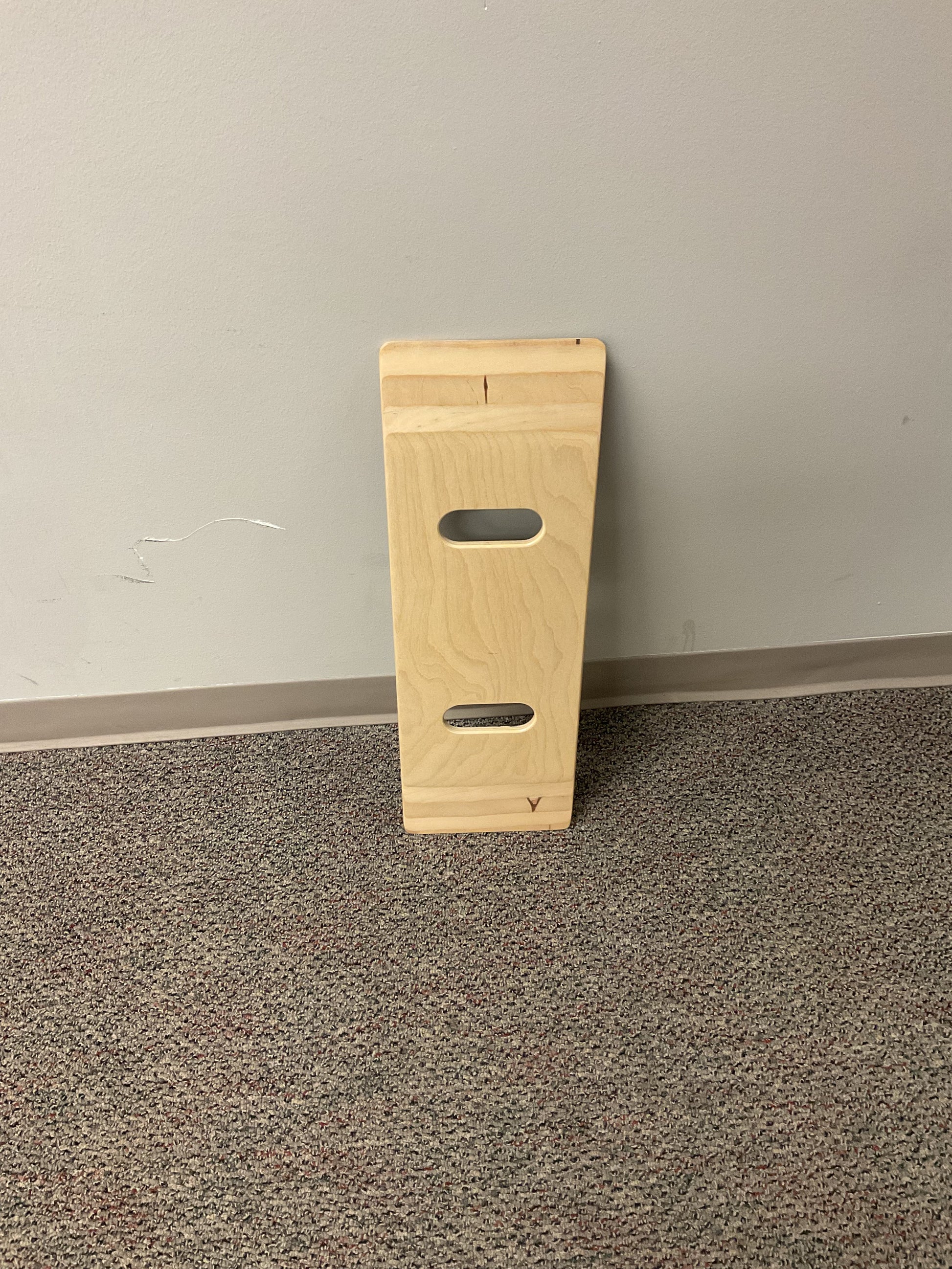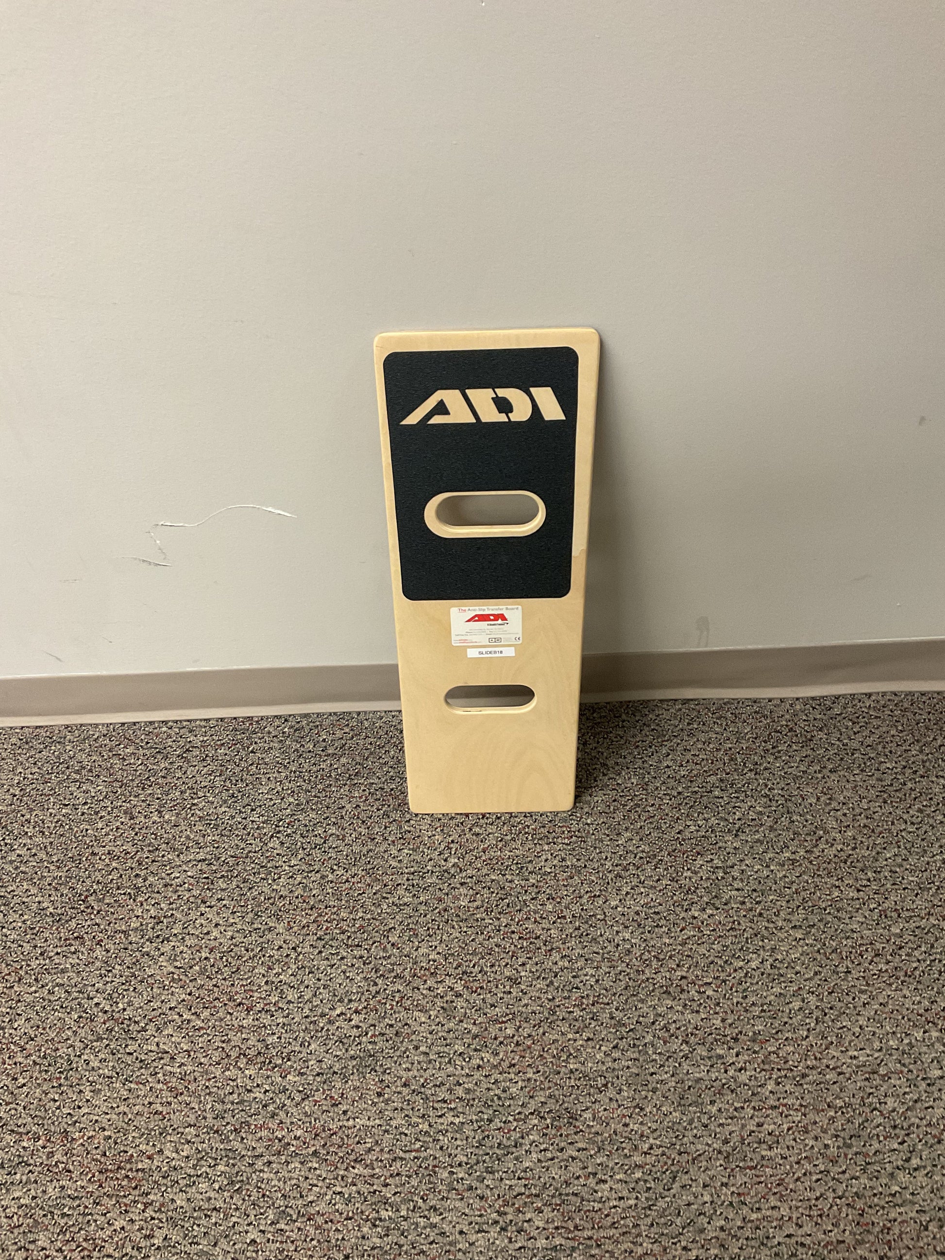 Wooden slide board with cut-out handles on both sides. 24" long and 8" wide. Anti-slip material on the back of one side. ADI brand.