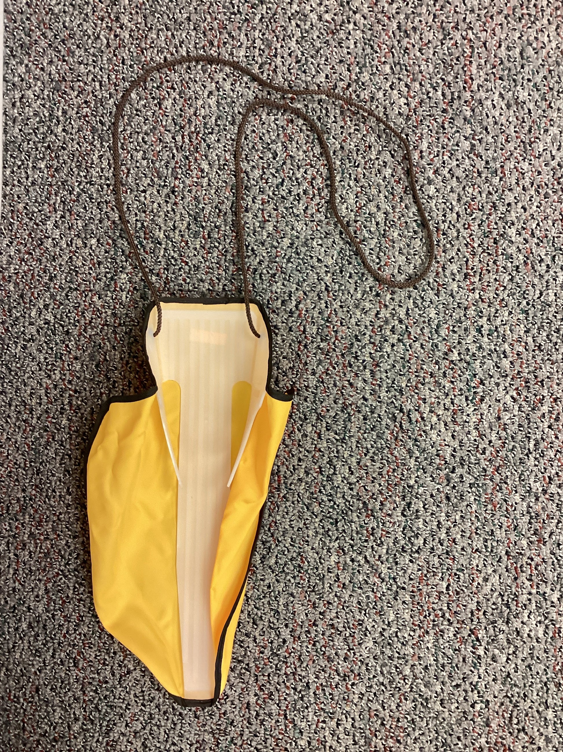 RFSU Rehab flexible orange sock aid that is 40" long with a rope handle. This sock aid has plastic lining that is 4.5" wide and 16" long. The area where the sock is placed and where the foot inserts is able to be stretched.