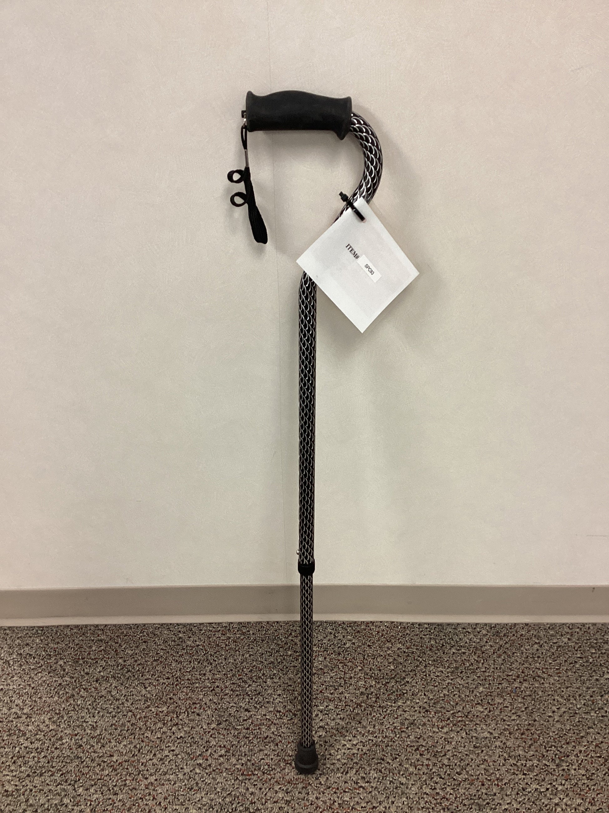 Black and silver patterned single point cane with foam handle, wrist strap, and non-skid rubber base. This cane is height adjustable from 30.5" to 39.5". No weight capacity is listed.