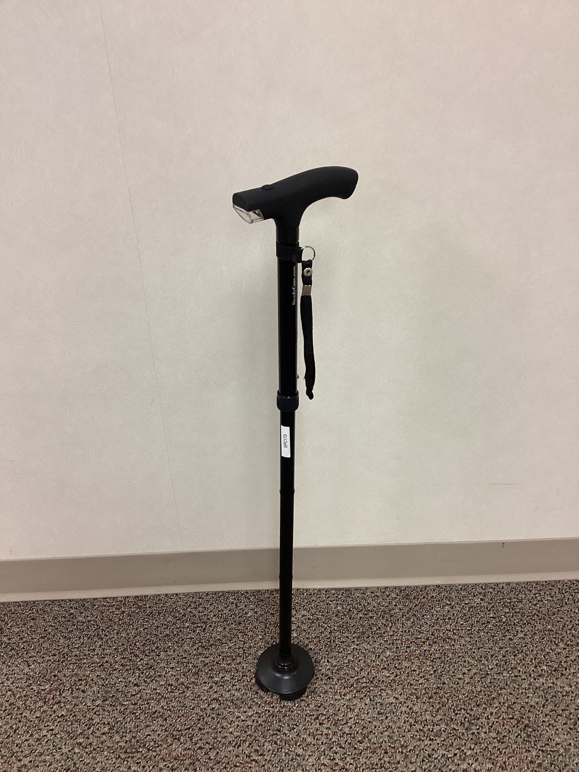 Steady Cane black single point self-standing cane with height adjustable and removable wrist strap. The handle has a flashlight that is powered by 3 AAA batteries (not included). The base of the cane is circular with a diameter of 3.5" with 4 points of contact. This cane is height adjustable from 27" to 32" and is foldable for more convenient storage.