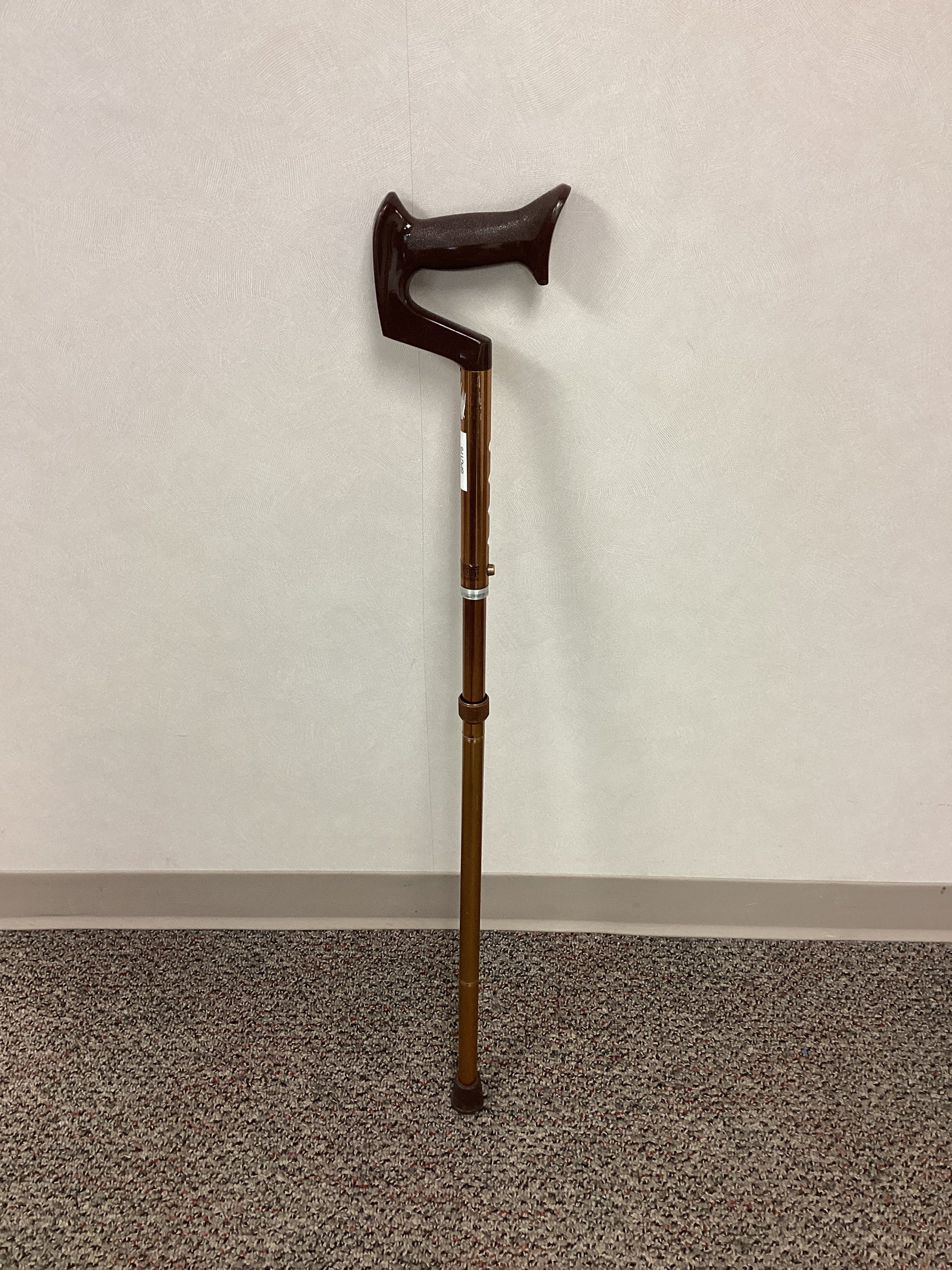 Kendall-Futuro gold/brown single point cane with a plastic handle and non-skid rubber base. This cane is height adjustable from 30.5" to 34.5" and foldable for more convenient storage. No weight capacity is listed.