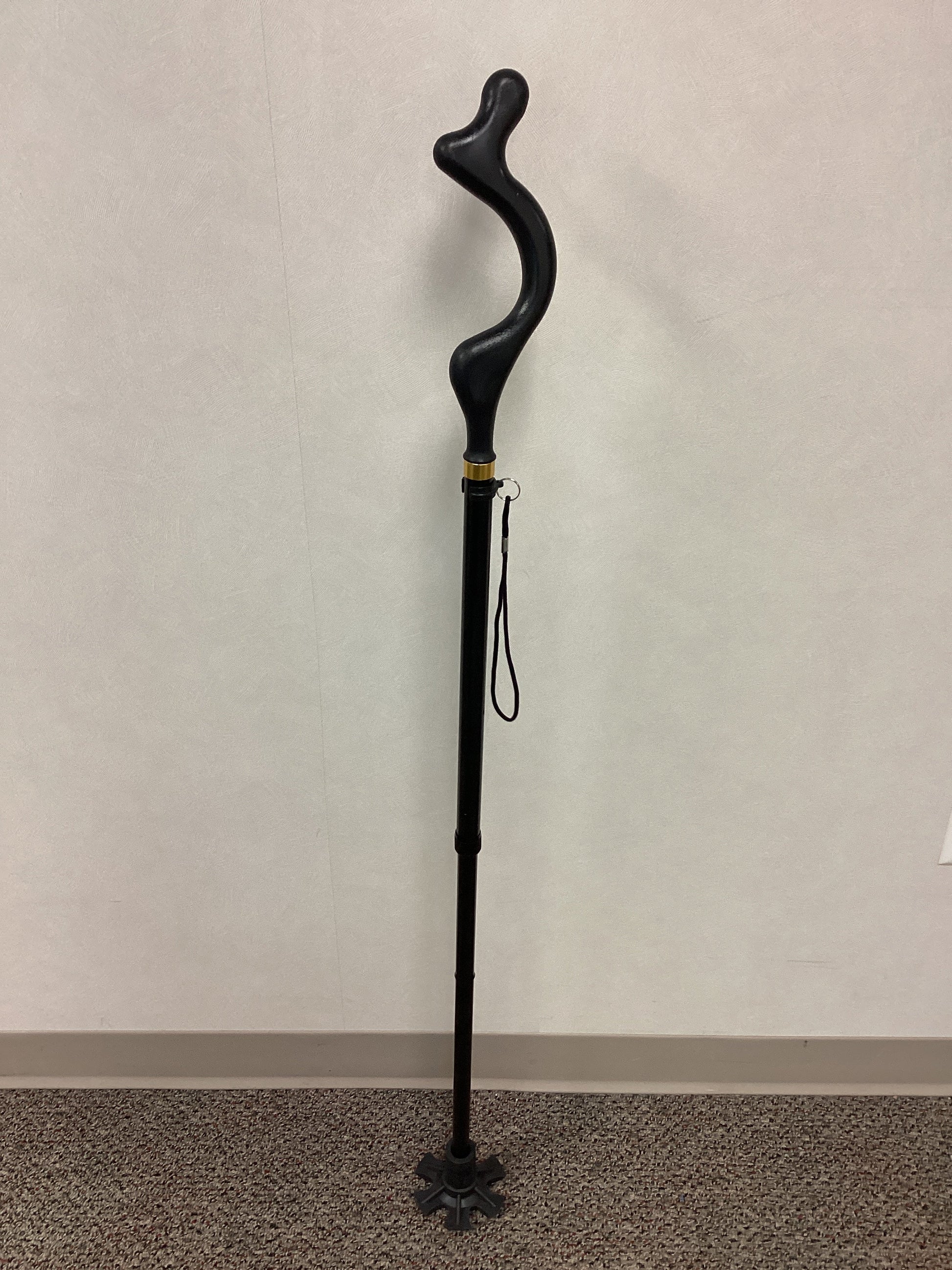 Black self-standing single point cane with plastic handle, height adjustable/removable wrist strap and non-skid rubber base. The handle is unique in shape. This cane is height adjustable from 40" to 49". The base is circular and 4.5" in diameter with 6 points of contact. No weight capacity is listed.