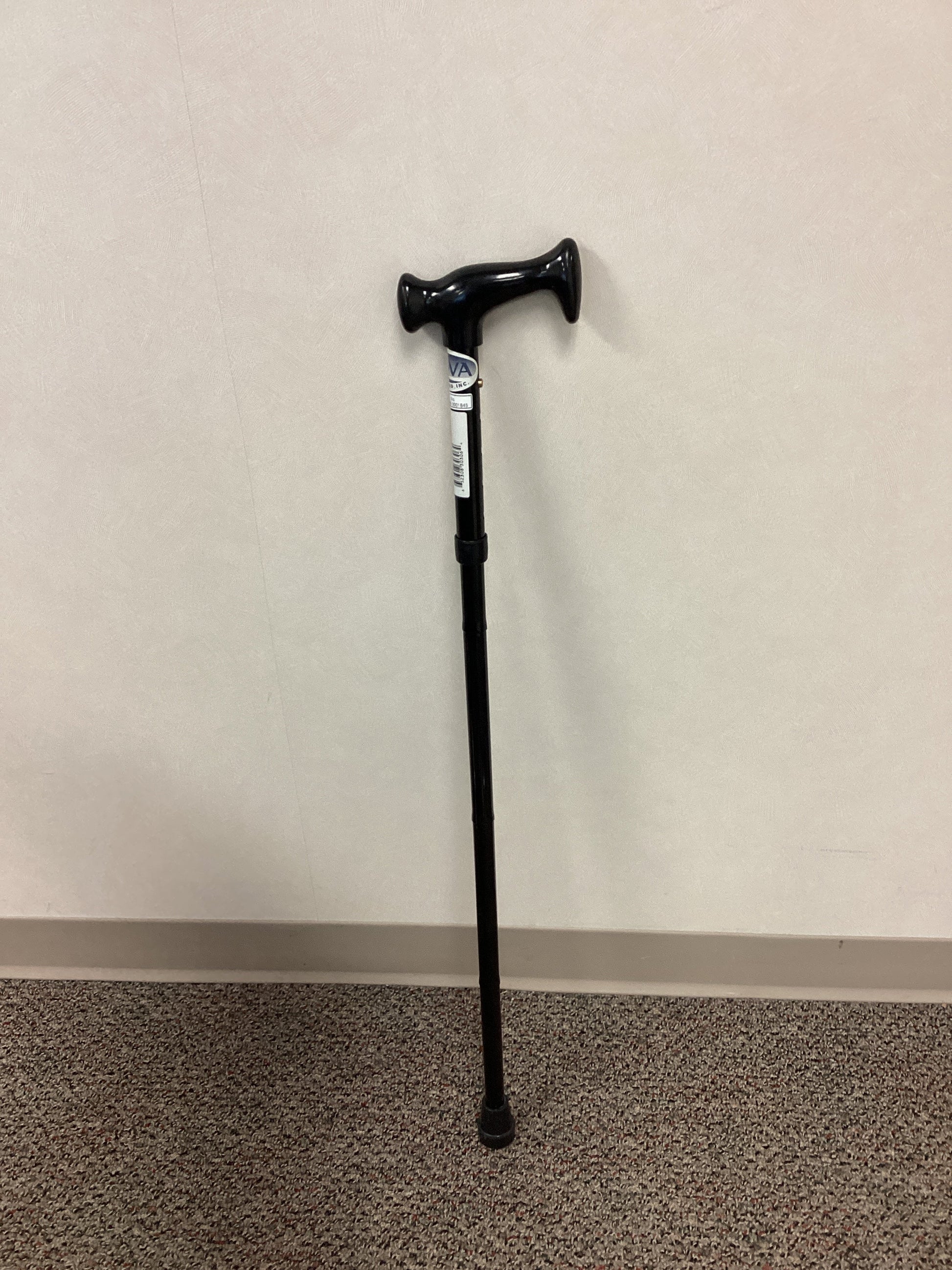 Nova brand foldable single point cane with plastic handle and non-skid rubber base. This cane is height adjustable from 33" to 37". No weight capacity is listed.