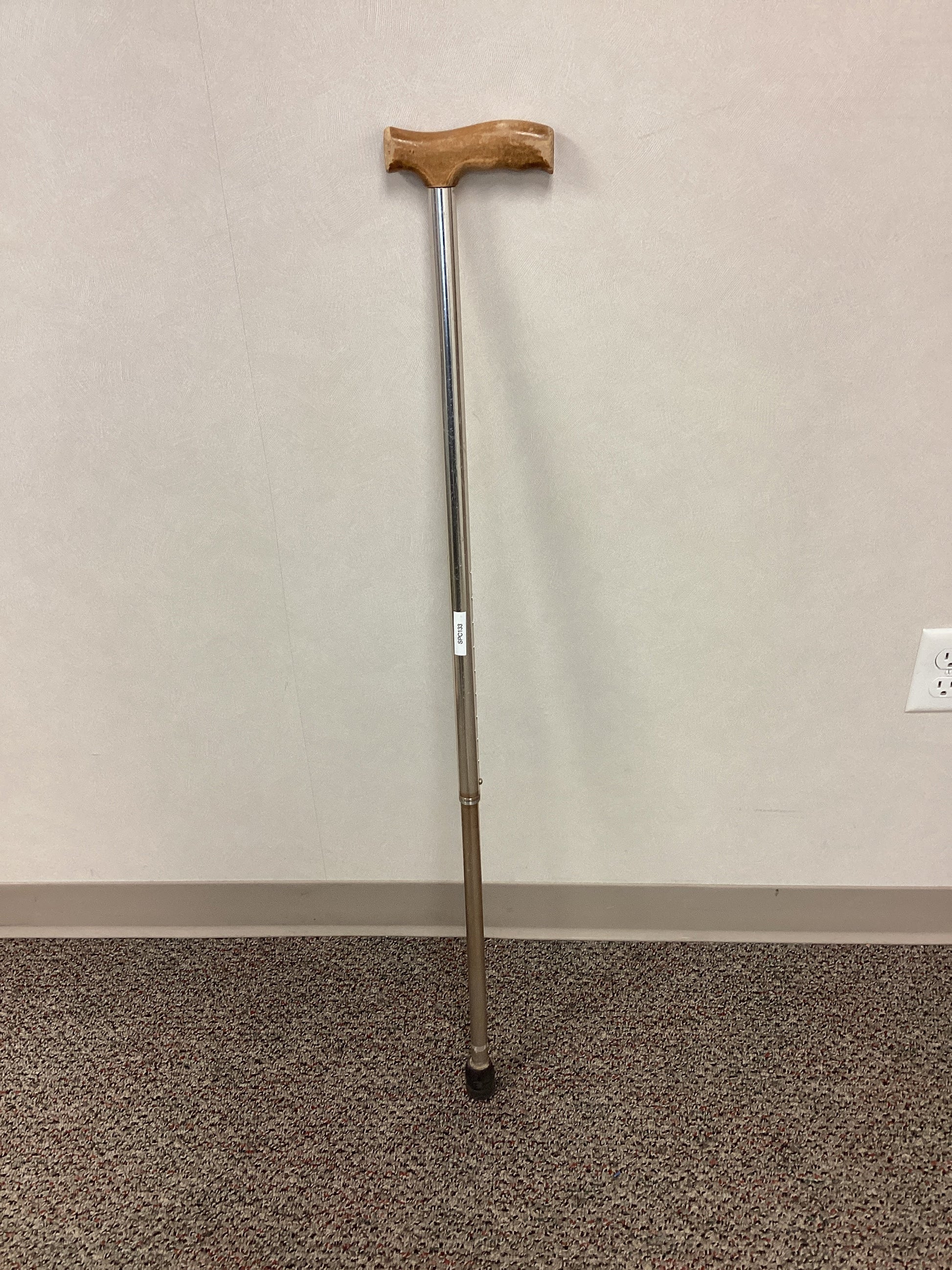 Steel single point cane with wooden handle and non-skid rubber base. This cane is height adjustable from 31" to 40". No weight capacity is listed.
