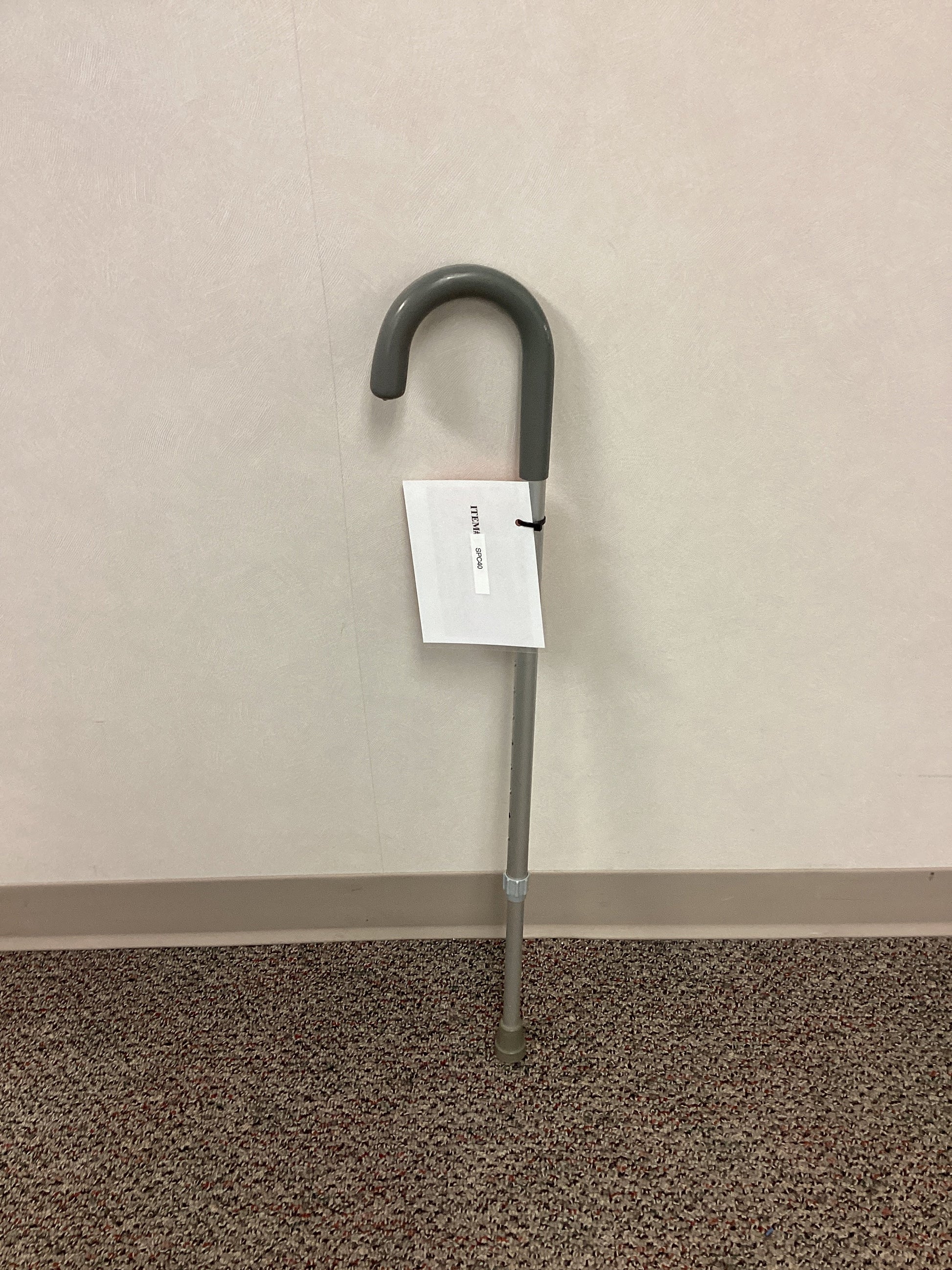 Aluminum single point cane with rubber handle and non-skid rubber base. This cane is height adjustable from 29.5" to 38.5". No weight capacity is listed.