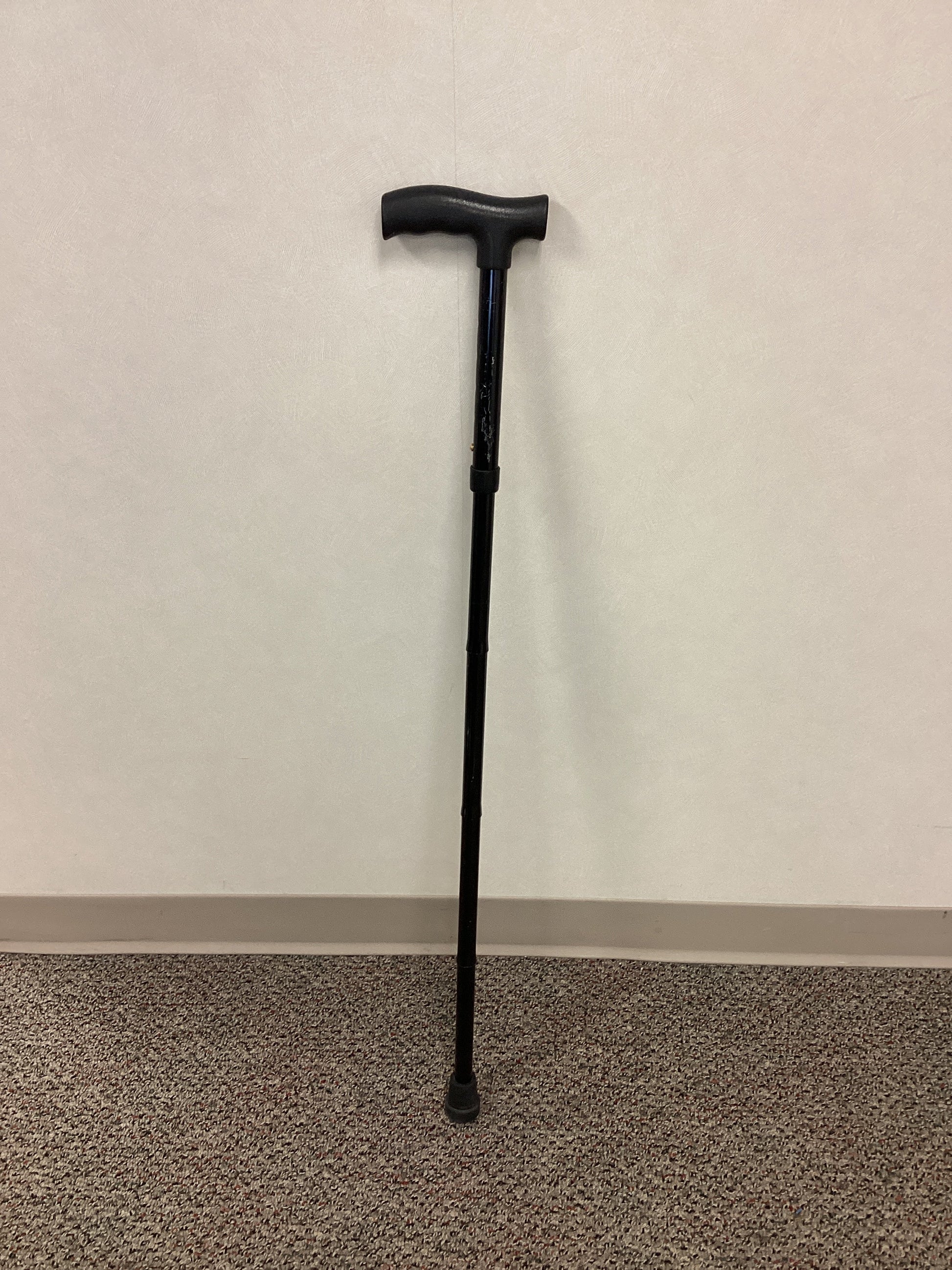 Black foldable single point cane with plastic handle and non-skid rubber base. This cane is height adjustable from 33" to 37". No weight capacity is listed.