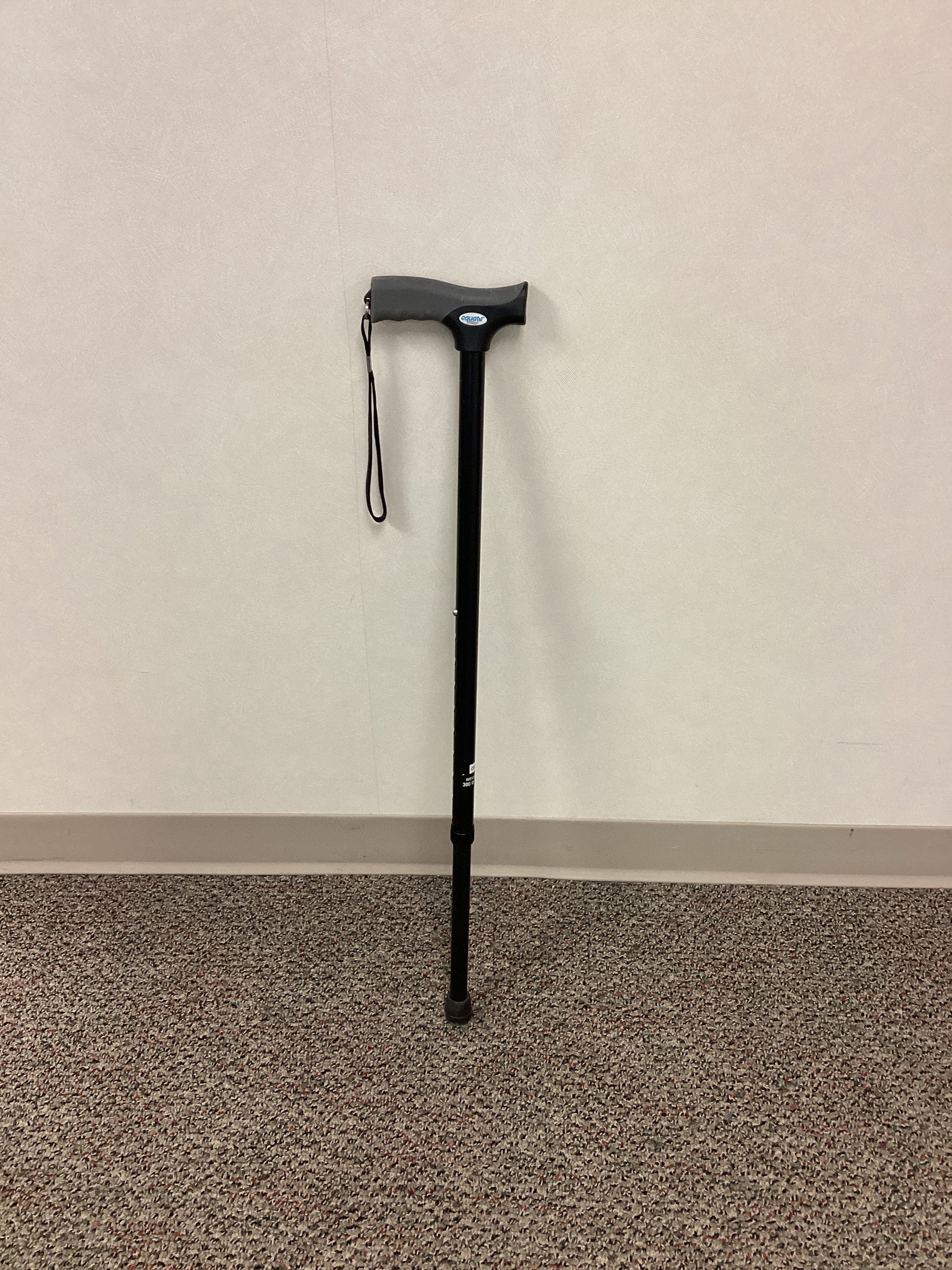 Equate brand black single point cane with rubber handle, wrist strap, and non-skid rubber base. This cane is height adjustable from 31" to 39.5". Weight capacity is 300 lbs.