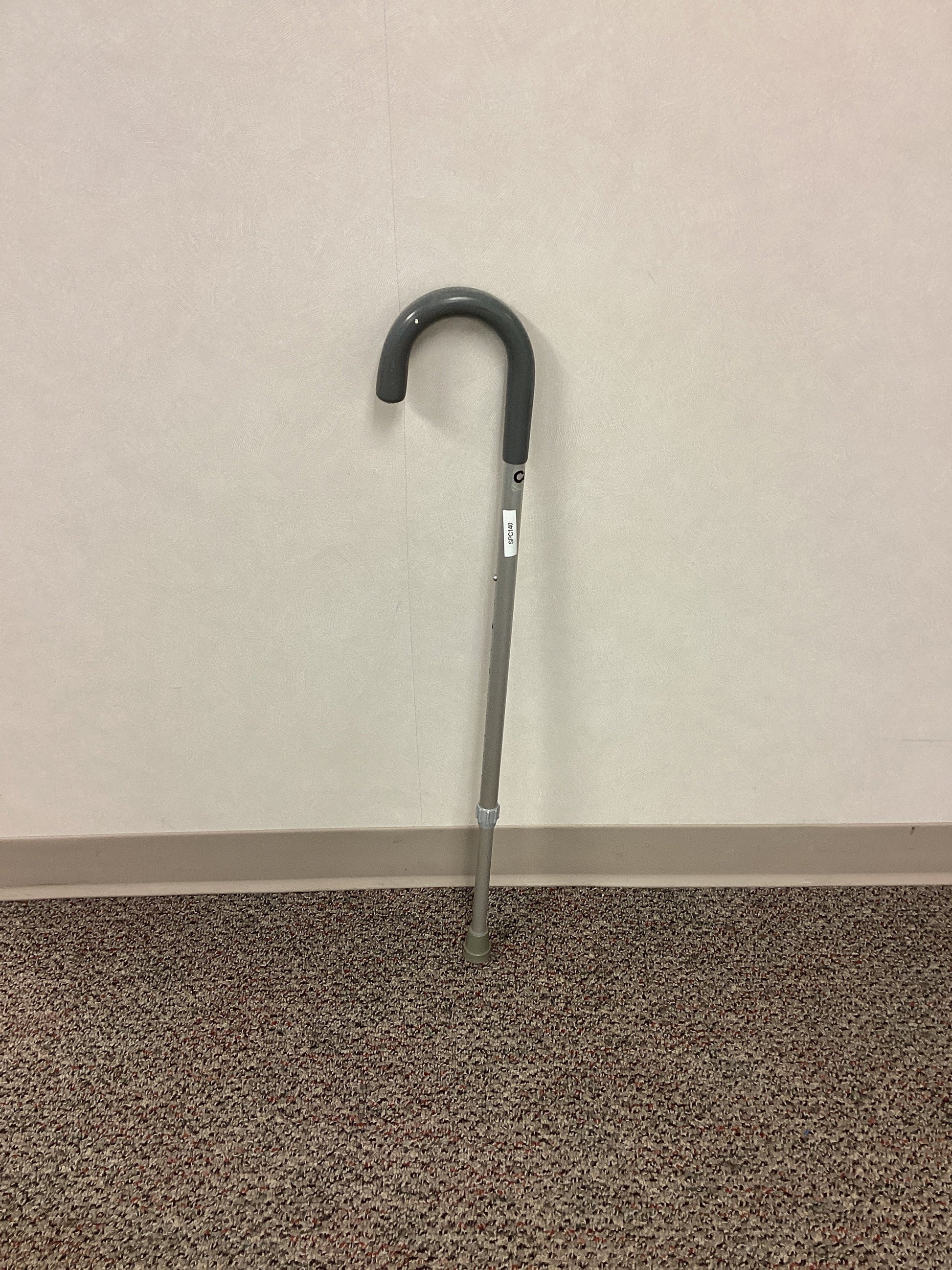 Carex brand aluminum single point cane with rubber handle and non-skid rubber base. This cane is height adjustable from 29.5" to 38.5". No weight capacity is listed.