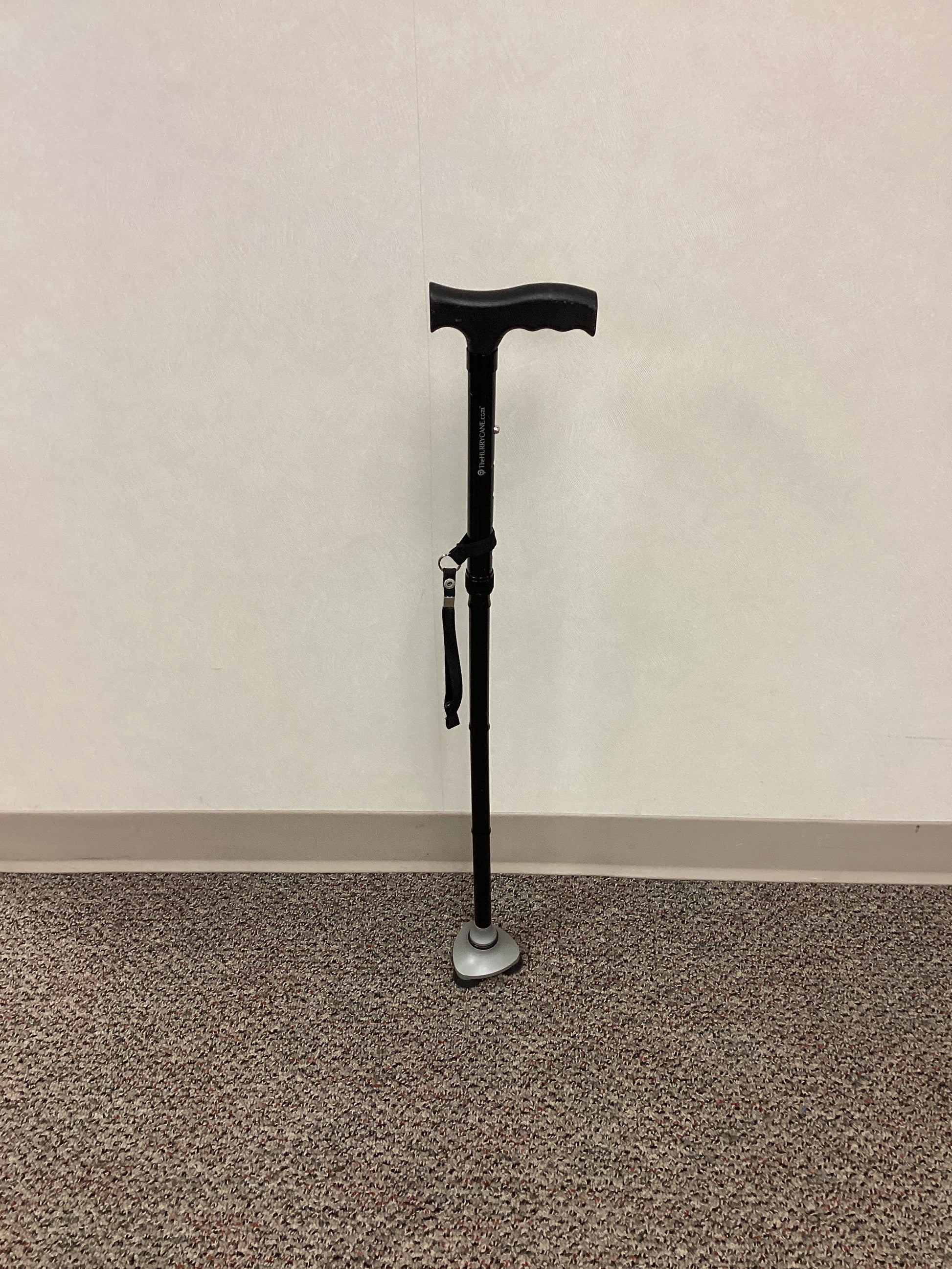 HurryCane brand black foldable single point cane with plastic handle, wrist strap, and non-skid rubber base with 3 points of contact. The base is 3.5" wide. This cane is height adjustable from 31.5" to 36". No weight capacity is listed.