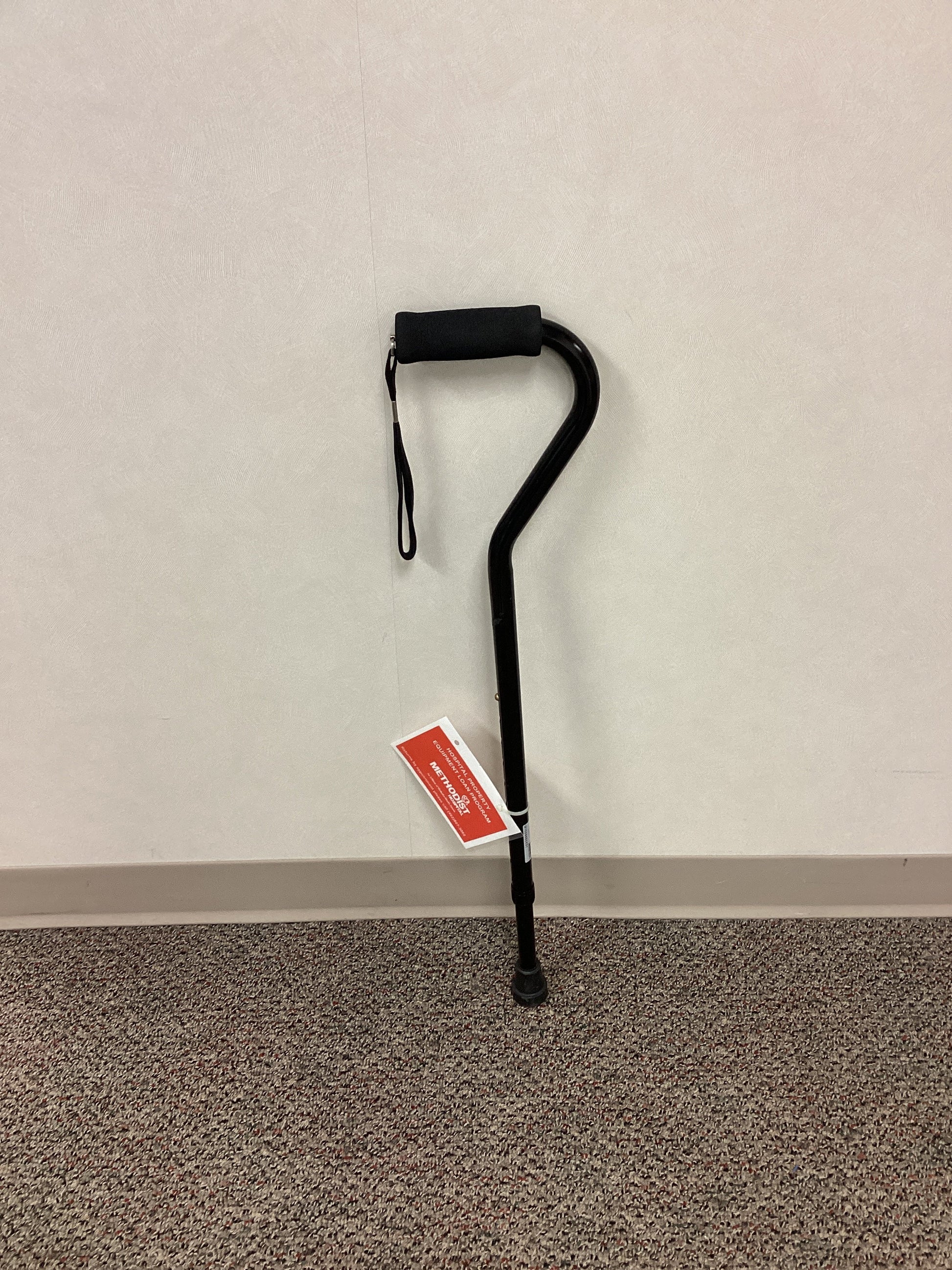 Drive brand black single point cane with foam handle, wrist strap, and non-skid rubber base. This cane is height adjustable from 30" to 39". No weight capacity is listed.