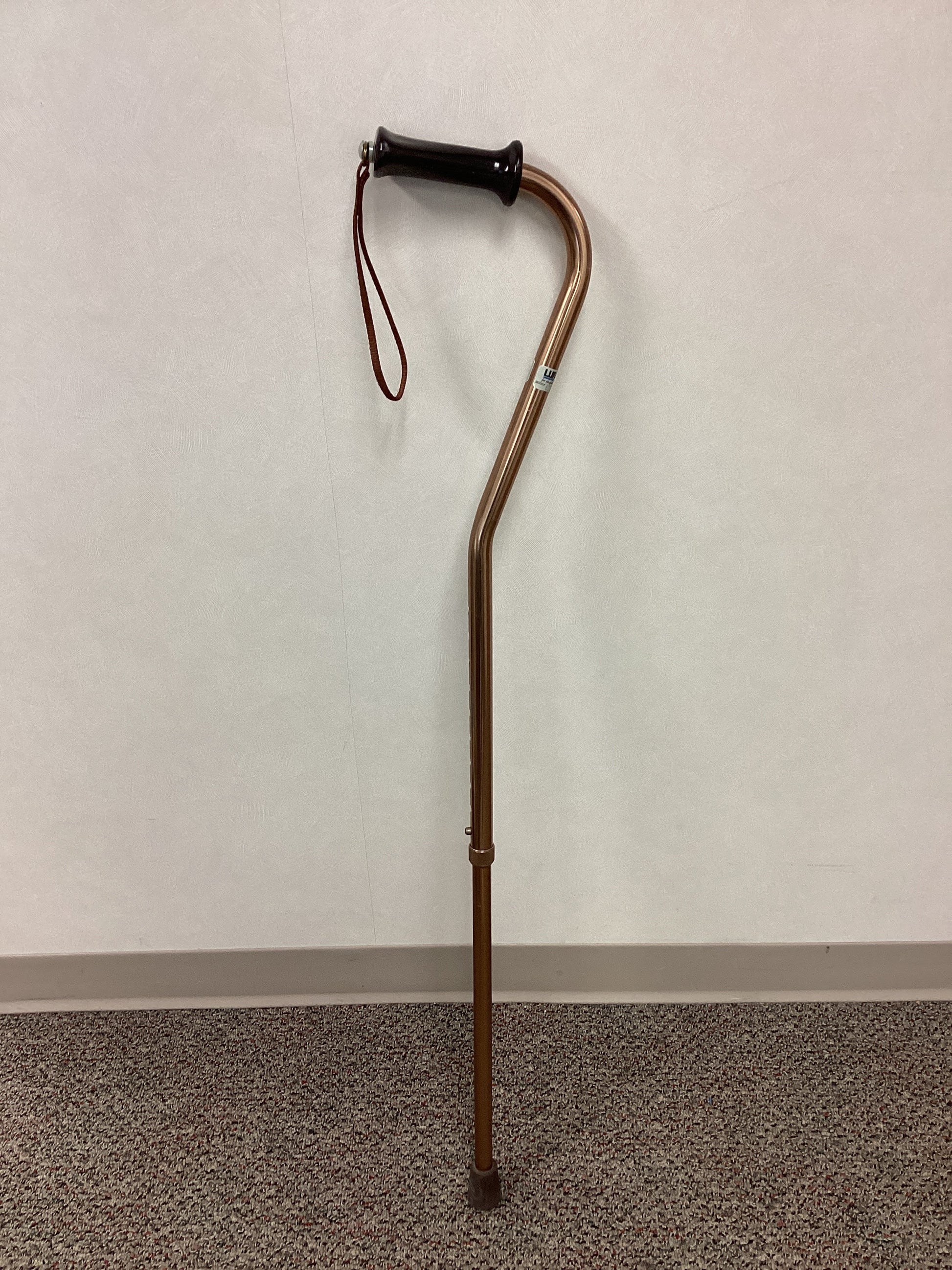 Lumex rose gold single point cane with plastic handle, wrist strap, and non-skid rubber base. This cane is height adjustable from 33" to 42". No weight capacity is listed. The handle is also 3" wide at it's widest point.