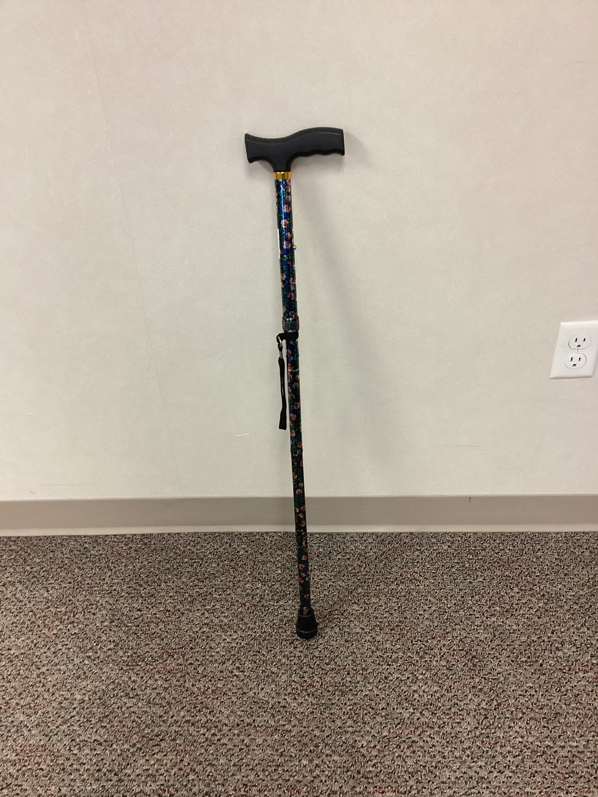 Foldable, floral single point cane with plastic handle, wrist strap and non skid rubber base. This cane is height adjustable from 32" to 36". No weight capacity is listed.