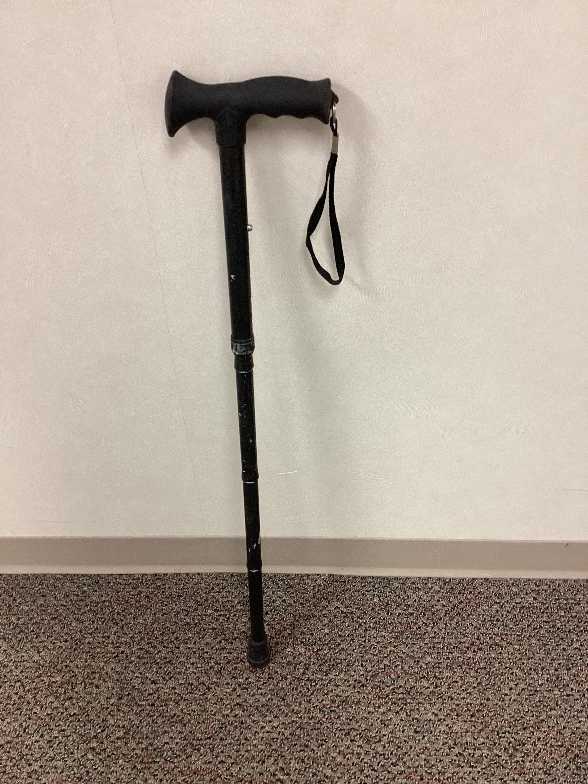 Nova brand foldable, black single point cane with rubber handle, wrist strap and non skid rubber base. This cane is height adjustable from 32" to 36". No weight capacity is listed.