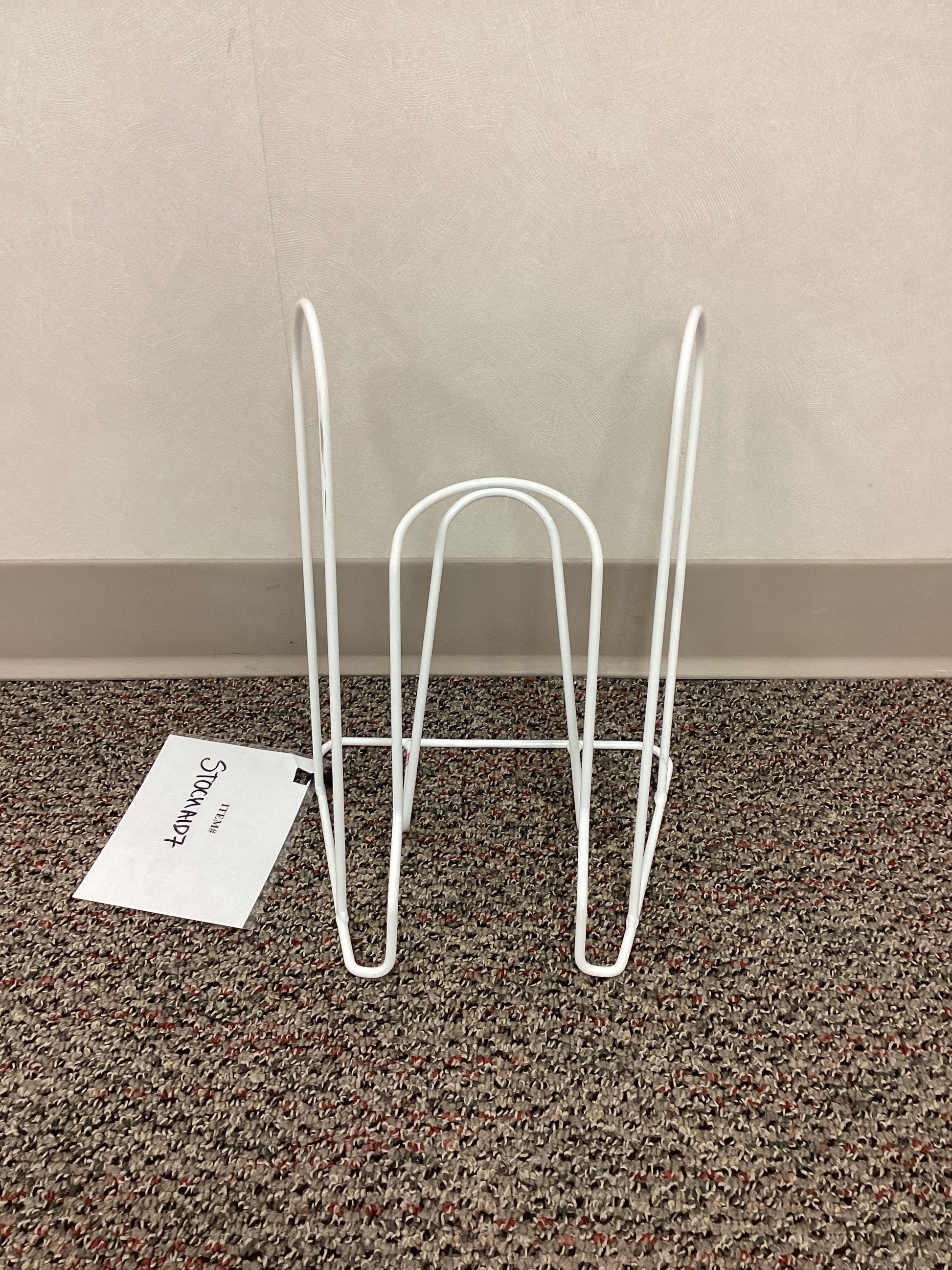 White metal stocking aid that is 13" tall. Handles are 9" wide and the area where the stocking is inserted is 4.5" wide.