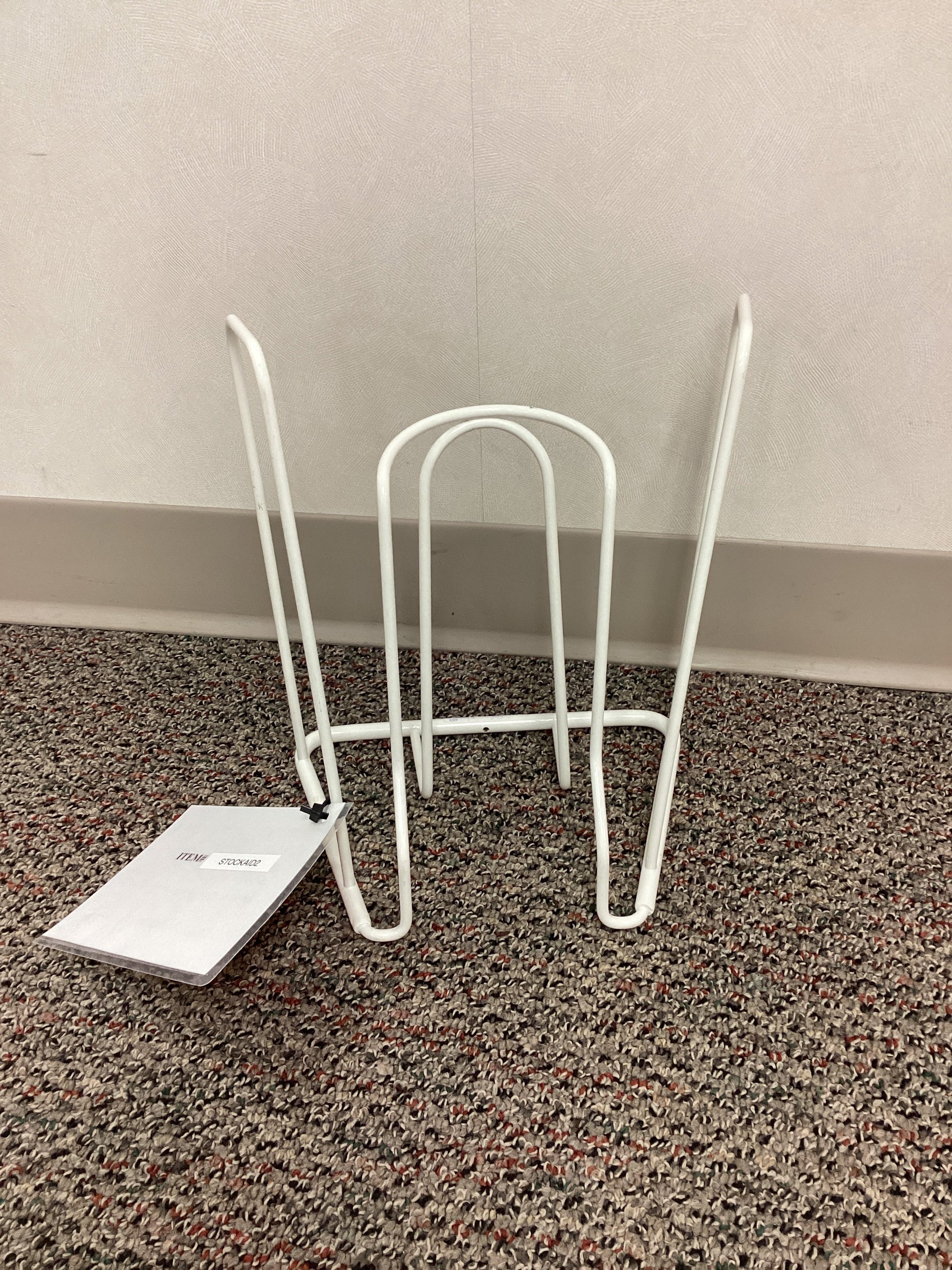 White metal stocking aid that is 11" tall. Handles are 9.5" wide and the area where the stocking is inserted is 4.5" wide.