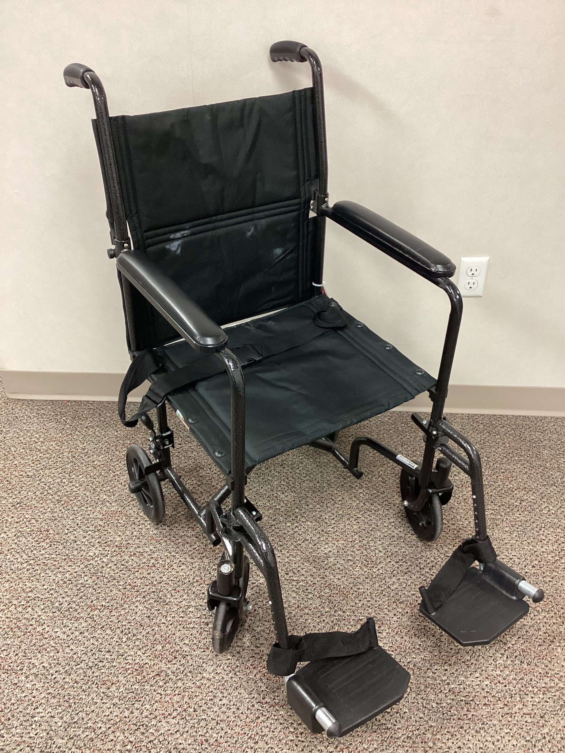 19"x15" Drive brand transport chair with non-removable, arm rests. Foot rests are swing away, removable, and height adjustable. Back rest height is 18" and seat to floor height is 17". The chair has 2 rear wheel brakes that are push forwards to lock. Chair is able to be folded (by lifting center of seat). The backrest is able to be folded down for ease of transport. The chair has a lab belt for safety of user. Weight capacity is 250 lbs.