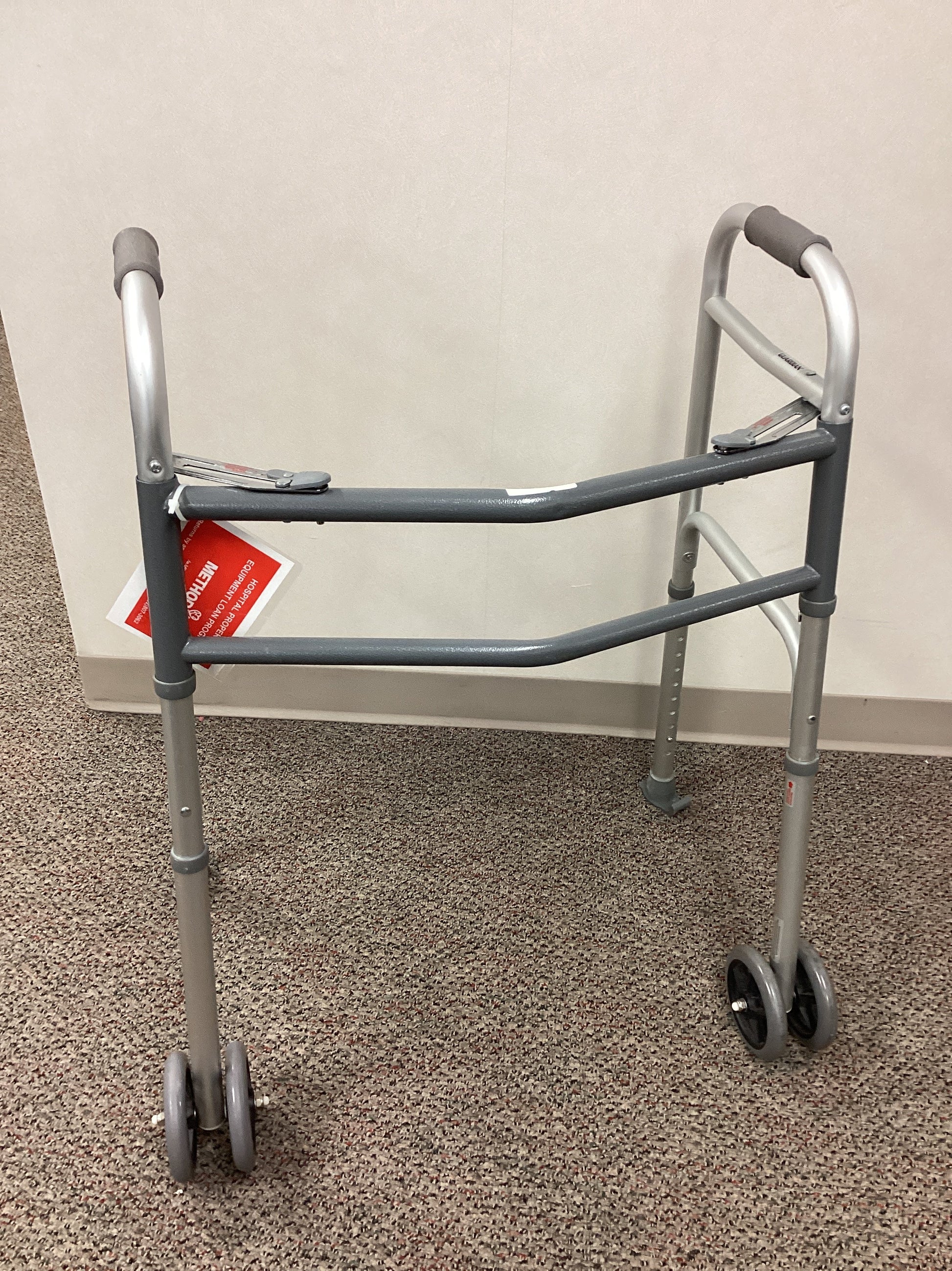 Gaurdian brand aluminum walker with rubber handles and 4 front wheels that are 5" in diameter (one on the outside and one on the inside of each front leg). The rear legs have skis. This walker is height adjustable from 32" to 43" and foldable for ease of transport with push-to-release buttons to fold. When unfolded, this walker is 28" wide from wheel to wheel. Weight capacity is 500 lbs.