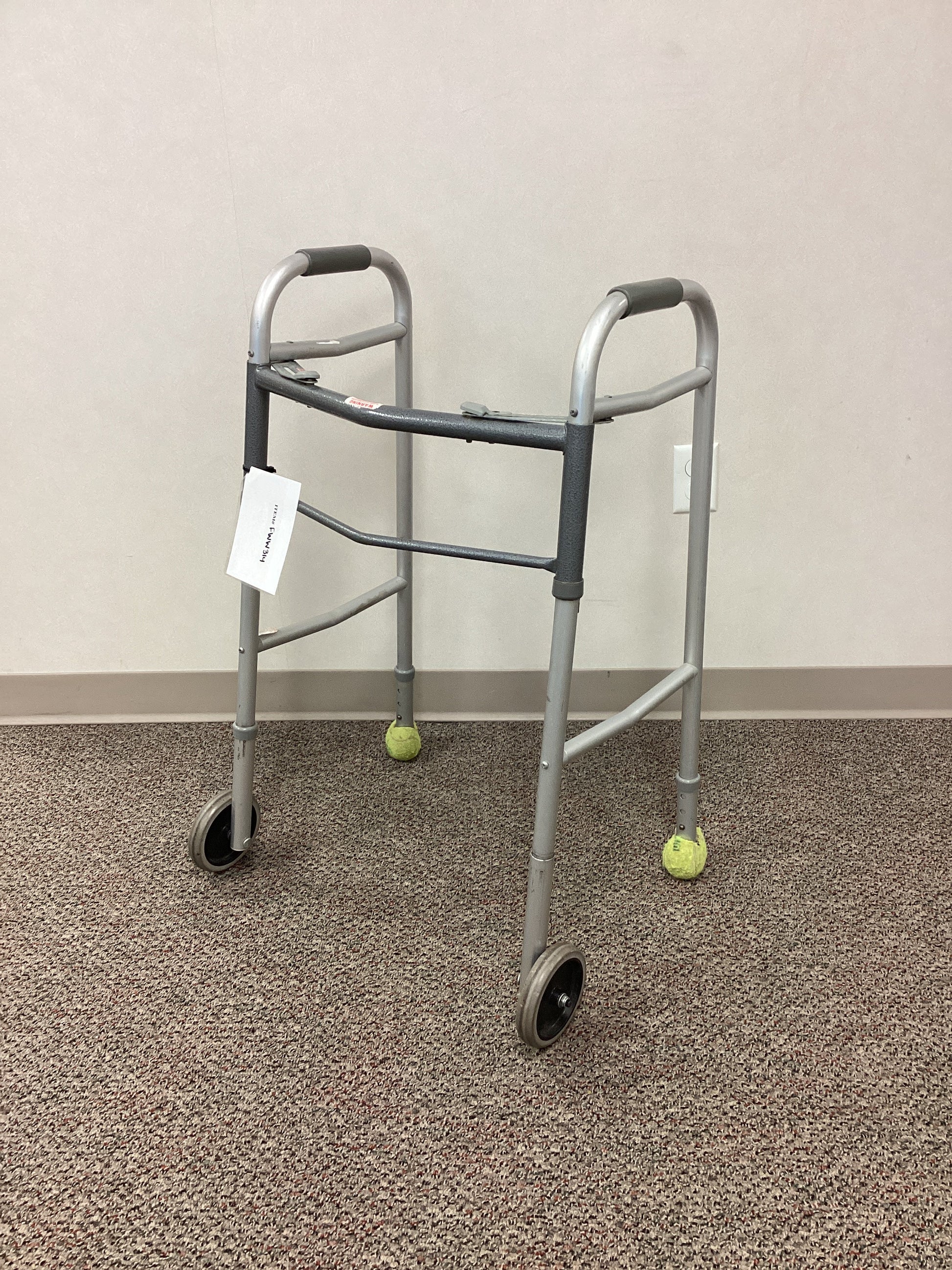 Aluminum walker with rubber handles and 2 front wheels that are 5" in diameter. The rear legs have tennis balls that are removable. This walker is height adjustable from 33.5" to 35" and foldable for ease of transport with push-to-release buttons to fold. When unfolded, this walker is 25" wide from wheel to wheel and the wheels can be adjusted to be on the outside or inside of the walker. No weight capacity is listed.
