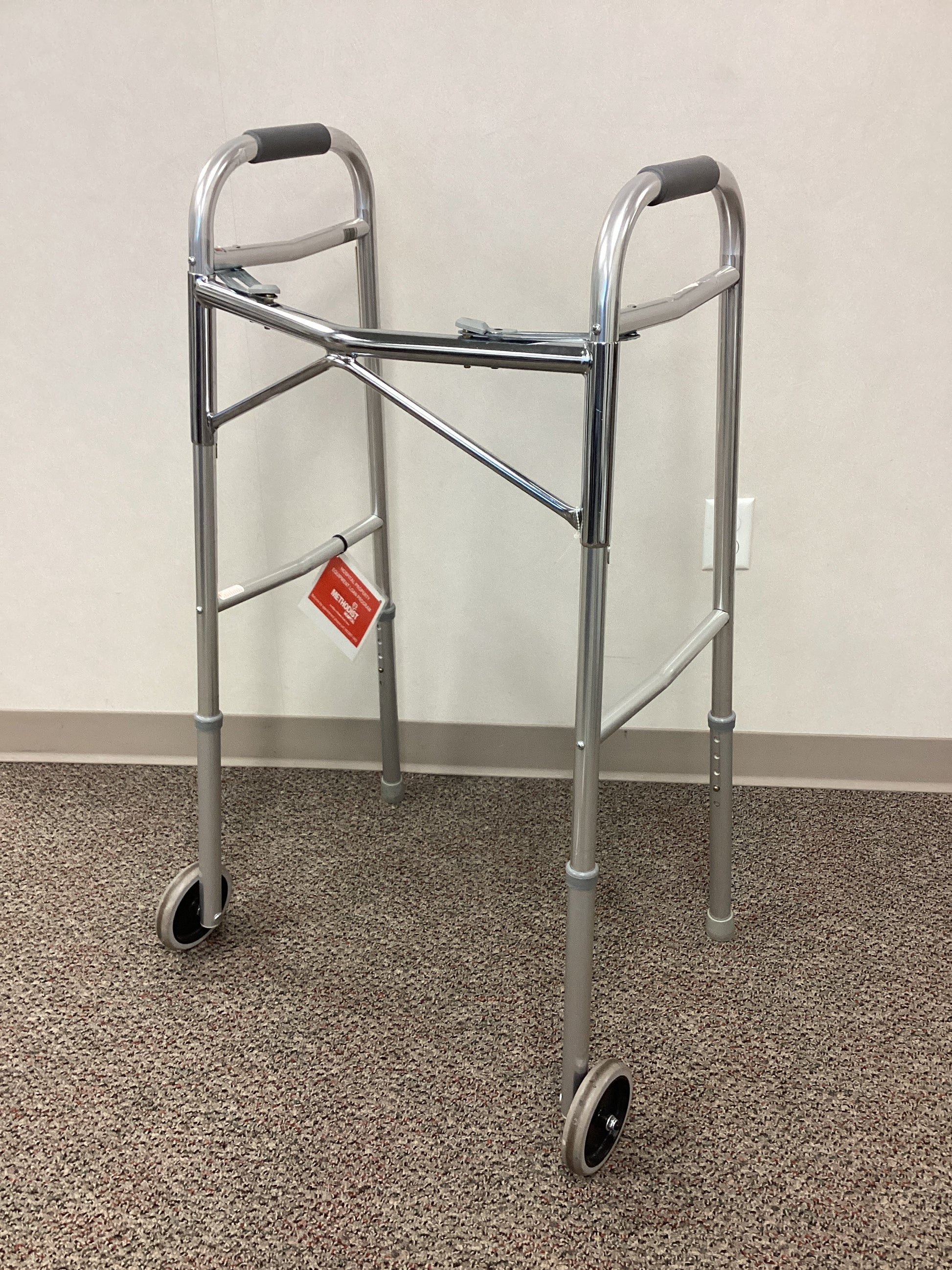Guardian brand steel walker with rubber handles and 2 front wheels that are 5" in diameter. The rear legs have non-skid rubber tips. This walker is height adjustable from 39.5" to 43.5" and foldable for ease of transport with push-to-release buttons to fold. When unfolded, this walker is 27" wide from wheel to wheel and the wheels can be adjusted to be on the outside or inside of the walker. Weight capacity is 300 lbs.