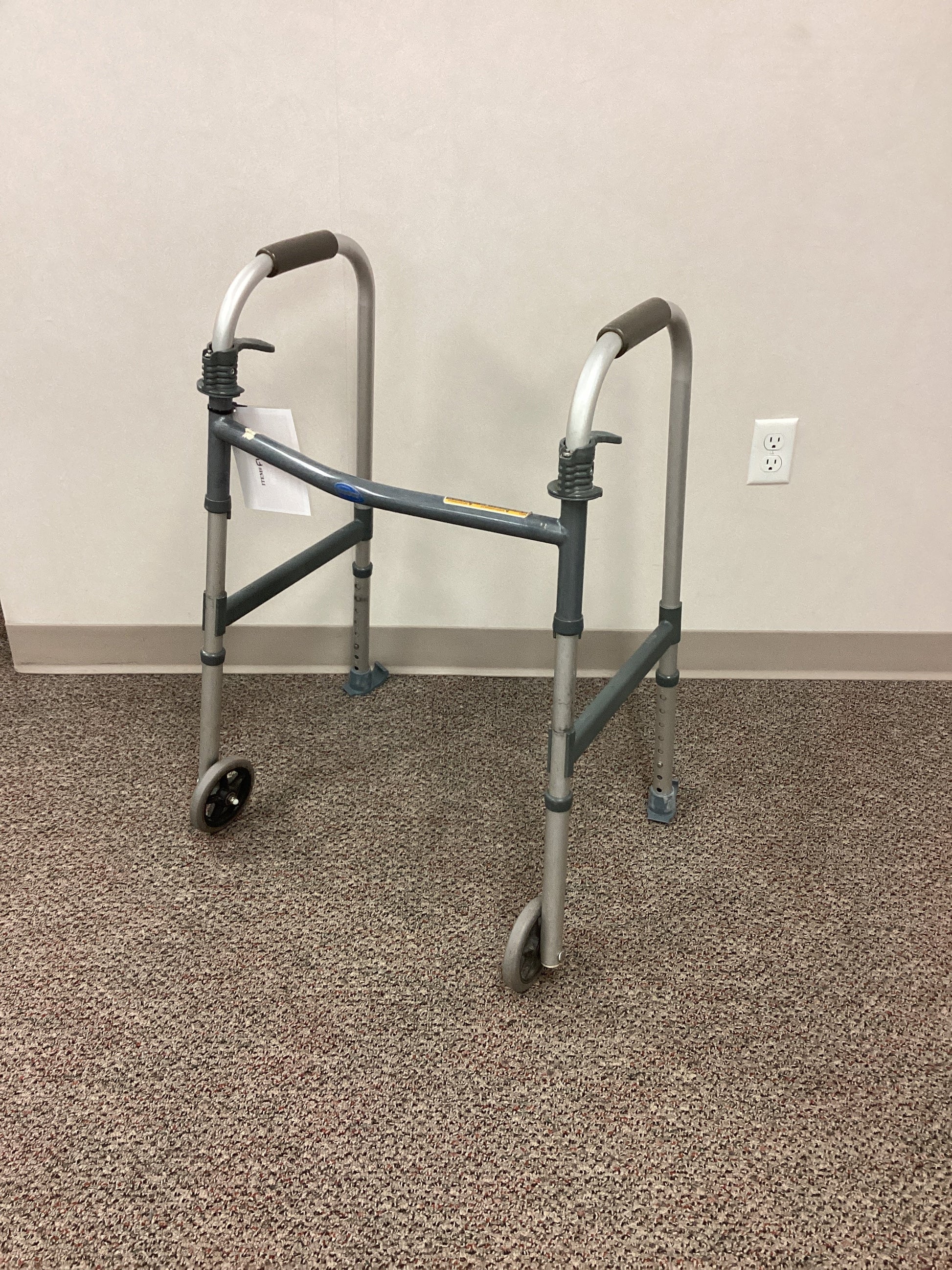 Invacare brand aluminum walker with rubber handles and 2 front wheels that are 5" in diameter. The rear legs have skis for a smoother glide. This walker is height adjustable from 31" to 38" and foldable for ease of transport with push-to-release buttons to fold. When unfolded the walker is 26" wide from wheel to wheel and the wheels can be adjusted to be on the outside or inside of the walker. No weight capacity is listed.