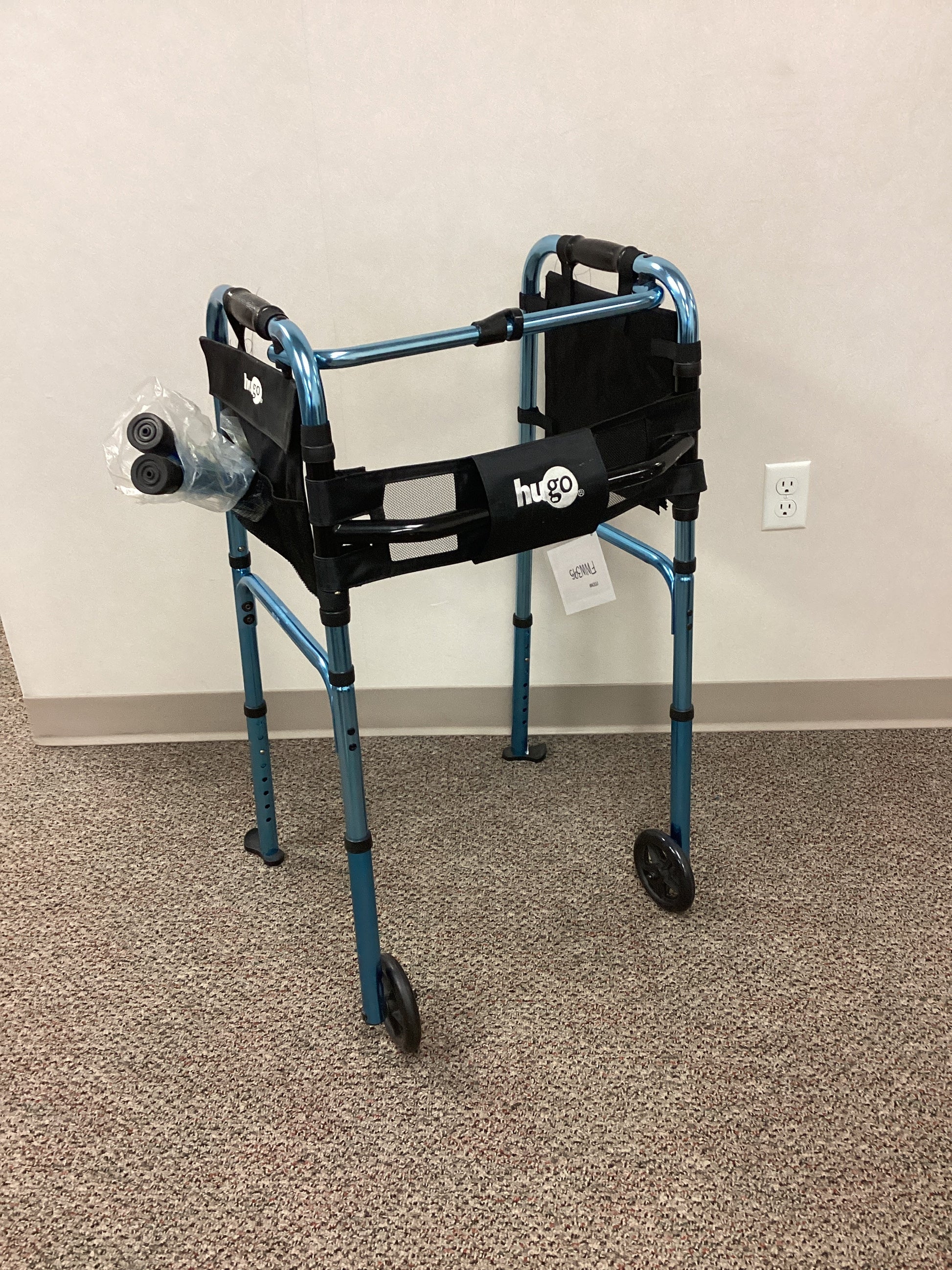 Hugo brand blue aluminum walker with rubber handles and 2 front wheels that are 5" in diameter. The rear legs have skis, but can be exchanged for legs with non-skid rubber tips. This walker is height adjustable from 30" to 36" and foldable for ease of transport with one press-to-release button to fold. This walker also comes with a non-removable velcro bag. When unfolded the walker is 23" wide from wheel to wheel and the wheels can be adjusted to be on the outside or inside of the walker. No weight capacity is listed.