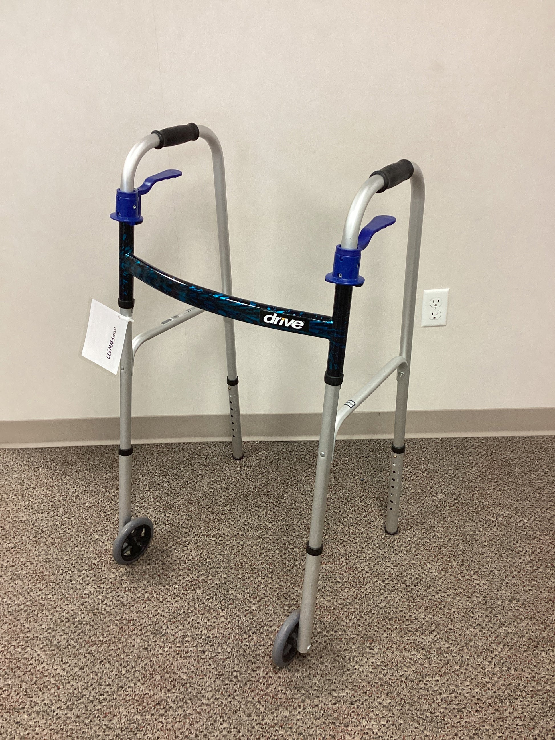Drive brand aluminum walker with rubber handles and 2 front wheels that are 5" in diameter. The rear legs have plastic tips. This walker is height adjustable from 32" to 39" and foldable for ease of transport with pull-to-release buttons to fold. When unfolded the walker is 24" wide from wheel to wheel and the wheels can be adjusted to be on the outside or inside of the walker. Weight capacity is 350 lbs.