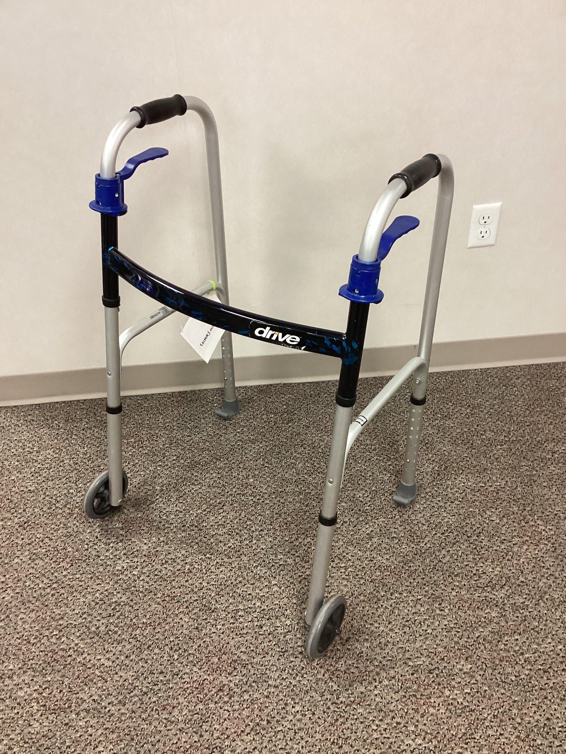 Drive brand aluminum walker with rubber handles and 2 front wheels that are 5" in diameter. The rear legs have skis. This walker is height adjustable from 32" to 39" and foldable for ease of transport with pull-to-release buttons to fold. When unfolded the walker is 24" wide from wheel to wheel and the wheels can be adjusted to be on the outside or inside of the walker. Weight capacity is 350 lbs.